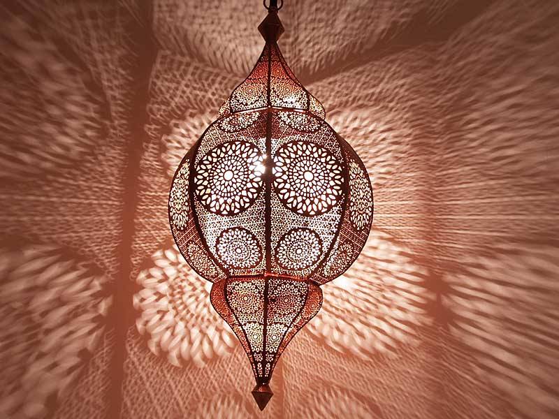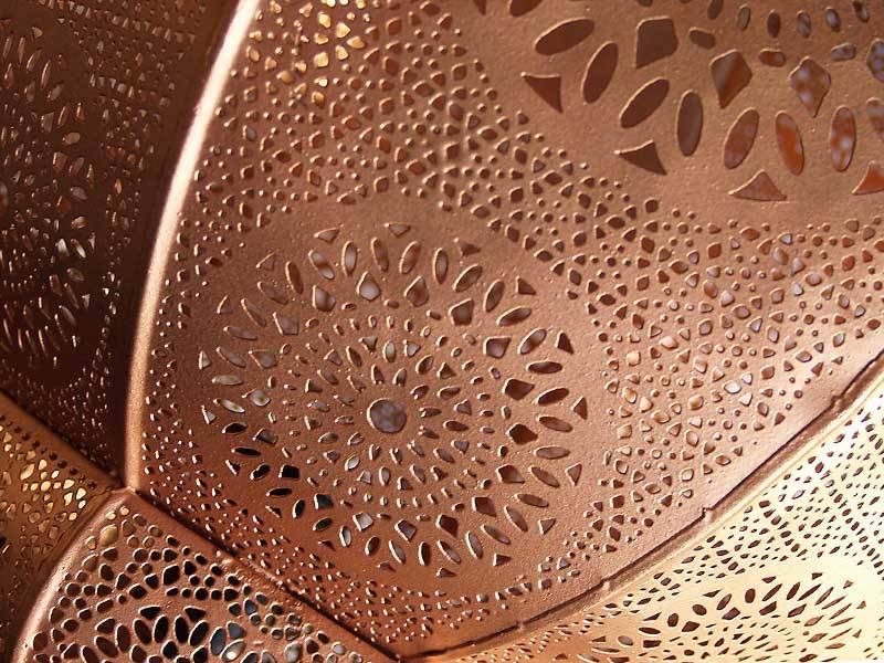 Warme sfeervolle hanglamp in 1001nacht sfeer, handgemaakt in India. Warme lamp doordat deze een koperkleur buiten en binnenkant heeft, daardooor schijnt hij gezellig door. De Marokkaanse hanglamp geeft gezellige bloemen patronen op de muur als hij aan is, deze patronen zijn er met de hand in gemaakt. De onderkant kunt u openmaken om er een lampje in draaien.