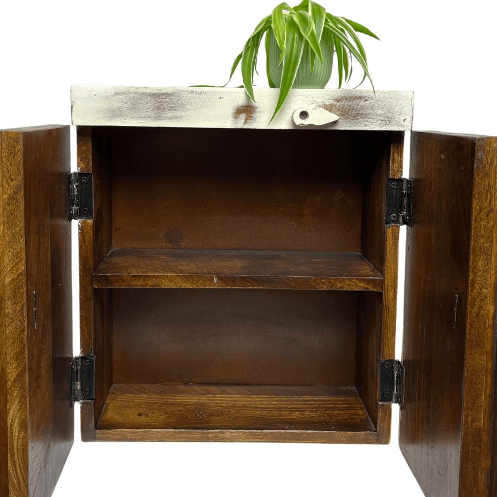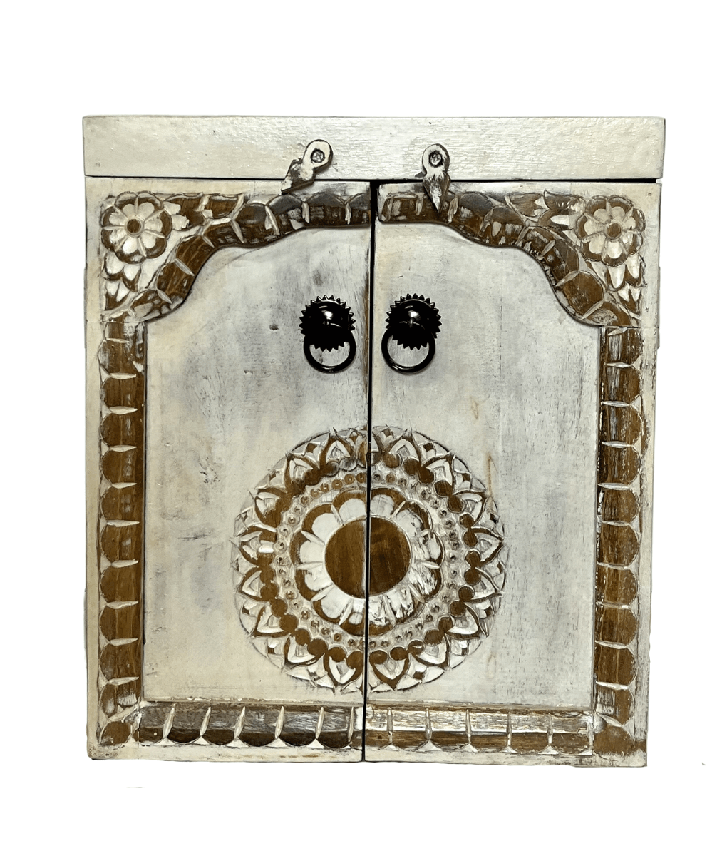 Handgemaakt badkamerkastje in een witte kleur in combinatie met een prachtige lotus bloem in het midden, deze is gemaakt van echt houtsnijwerk in India. Het kastje heeft twee deurtjes en in de binnenkant zit een plank om spulletjes op te leggen. Gemaakt van zwaar mango hout.