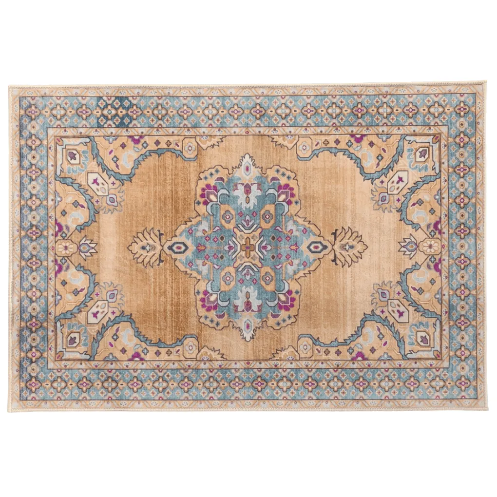 Een zachte badmat voorzien van een mooie kelim print. In een fris perzik/ beige kleurtje met blauwe accenten.