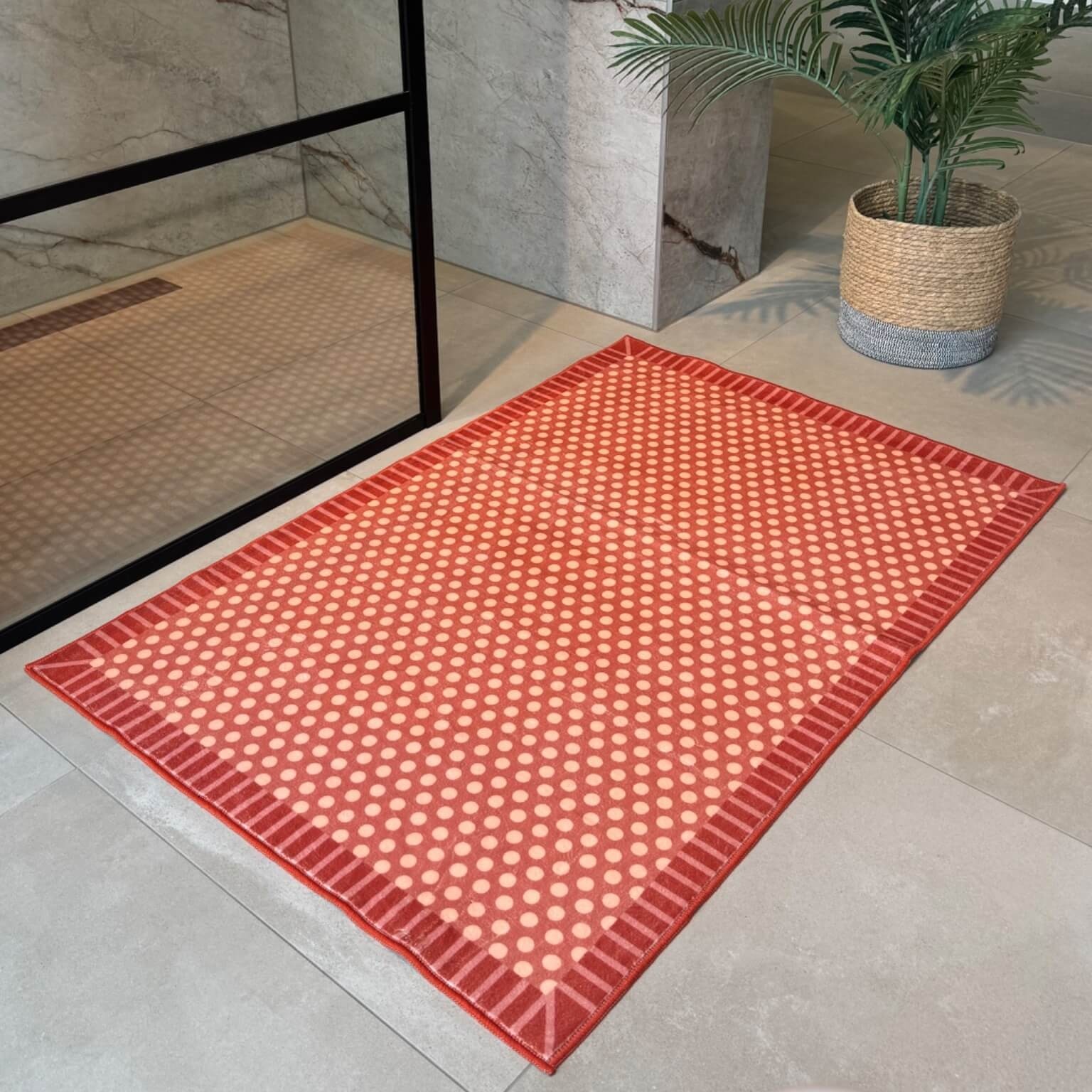 Een lieve badmat in een trendy terra kleurtje met zacht roze stippels. Met deze badmat is jouw badkamer in één stap een stuk gezelliger en kleurrijker!