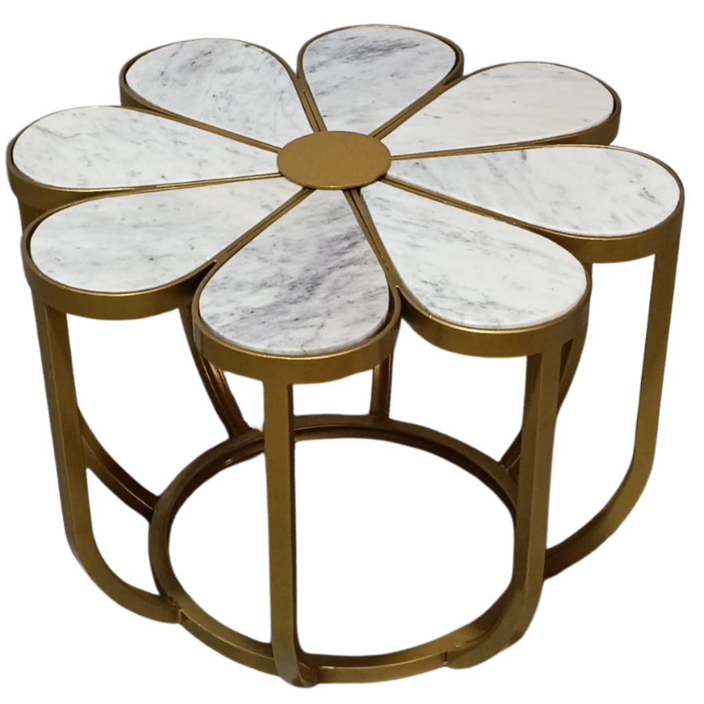 Breng een vleugje elegantie en speels design in je interieur met dit goudkleurige bijzettafeltje in de vorm van een bloem met de balderen van marmer. Het unieke ontwerp combineert luxe met een speelse uitstraling, waardoor het tafeltje direct een echte blikvanger is in elke ruimte.