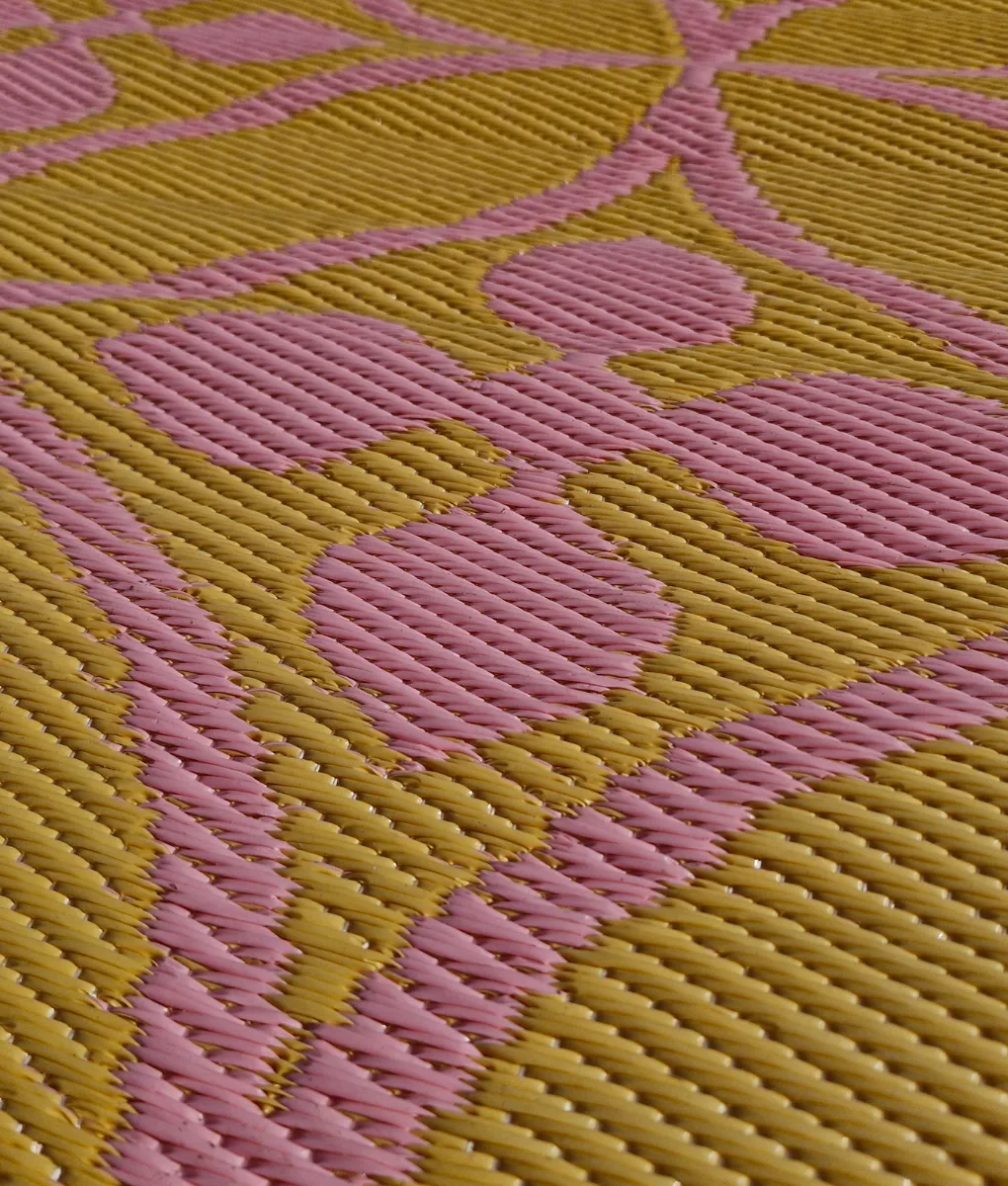 Buitenkleed in een roze met okergele kleur en een schattig bloemen patroon. Alle kleden zijn dubbelzijdig te gebruiken. Het unieke design maakt het een echte eyecatcher voor in de tuin. Door het lieve patroon ook ontzettend leuk om te gebruiken voor een kinder speelplekje in de tuin, want het kleed wordt door de zon lekker zacht aan de kinderhandjes en voetjes. Er zit een UV beschermingslaag op en ook doordat het plastic is is het geschikt voor mensen die allergisch zijn.
