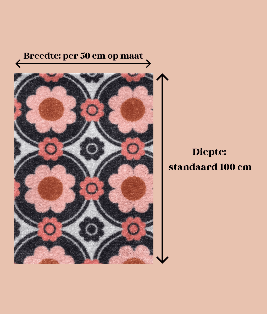 De standaard diepte is 1 meter en de breedte is oneindig te bepalen. Deze matten op maat worden (meestal) gebruikt om in de uitsparing in de vloer te leggen, als u het op de vloer legt kies dan voor een mat met vinyl rand of snij hem zelf helemaal naar wens.