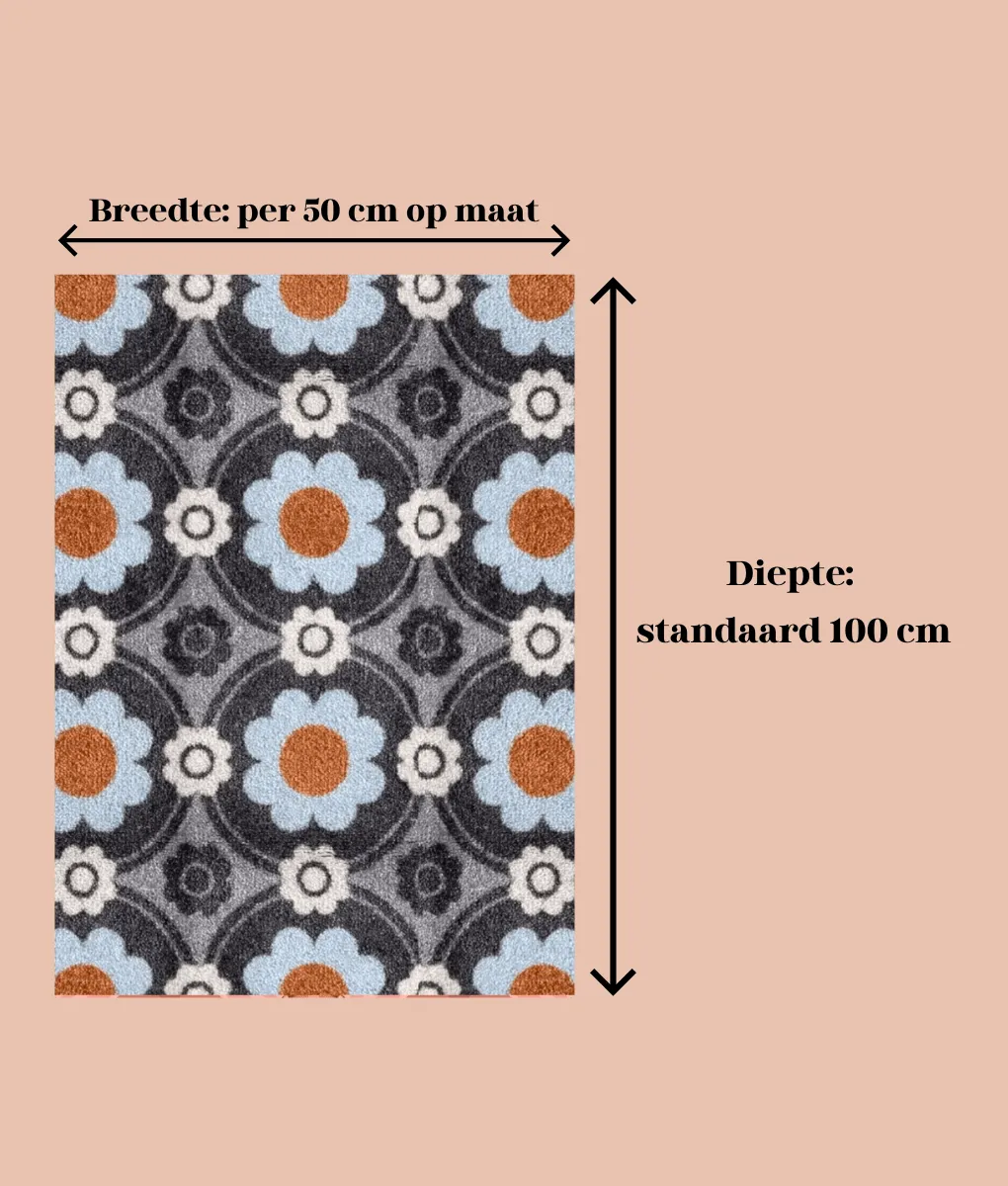 De standaard diepte is 1 meter en de breedte is oneindig lang mogelijk. Wilt u een deurmat breder dan 3 meter? Stuurt u ons dan even een mail.