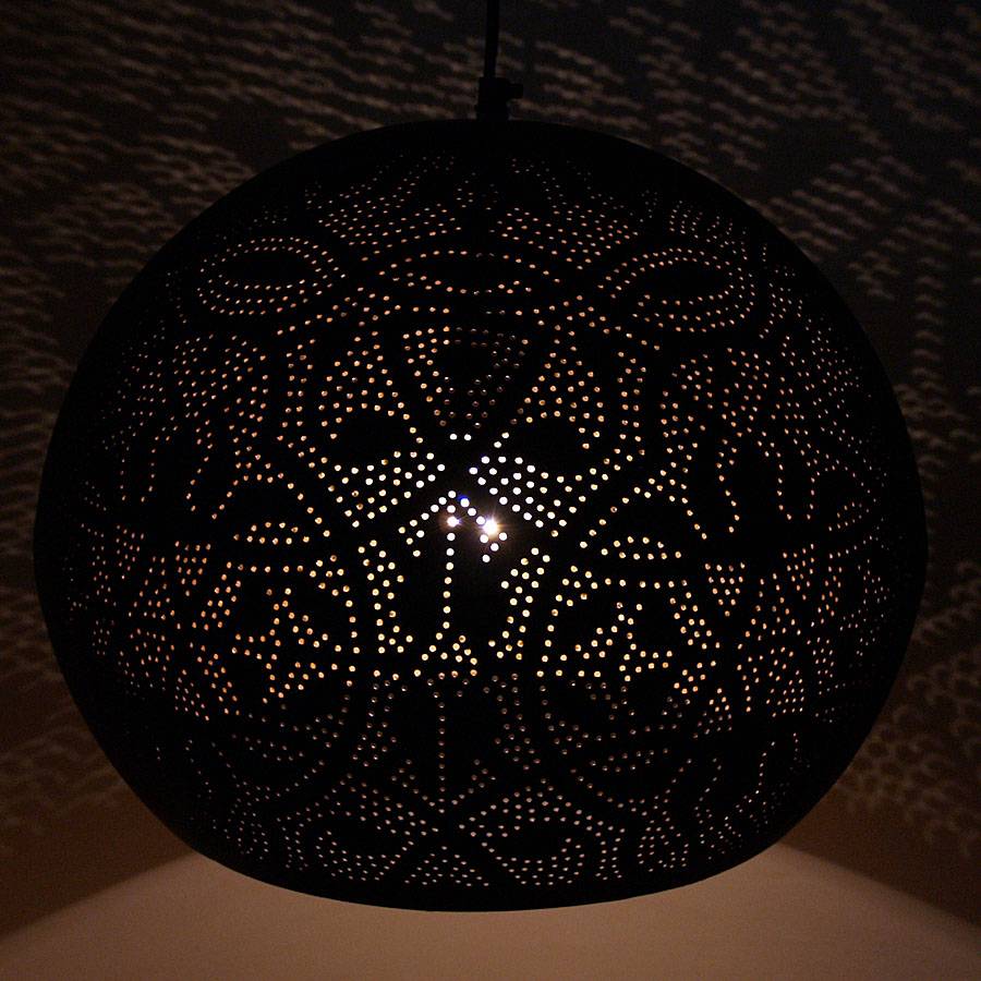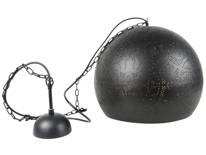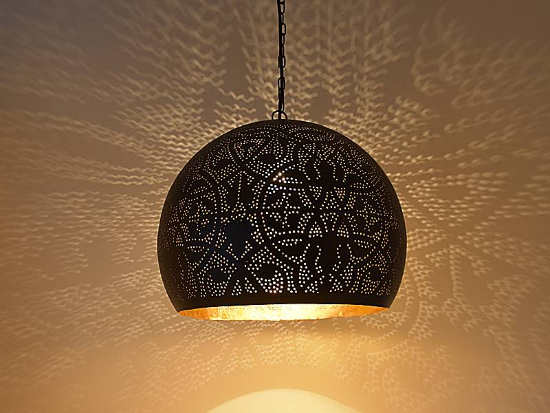 Mooie filigrain hanglamp, deze filigrain lamp is aan de buitenkant zwart en de binnenkant is bewerkt met bladgoud vintage kleur. Dit geeft extra warm licht doordat het metaal bewerkt is en daarom ziet u prachtige patronen er omheen schijnen en maakt dit tot een prachtige sfeervolle hanglamp. Door de bolle vorm geeft deze filigrain lamp mooi licht en weerkaatst de bladgouden binnenkant mooi af.