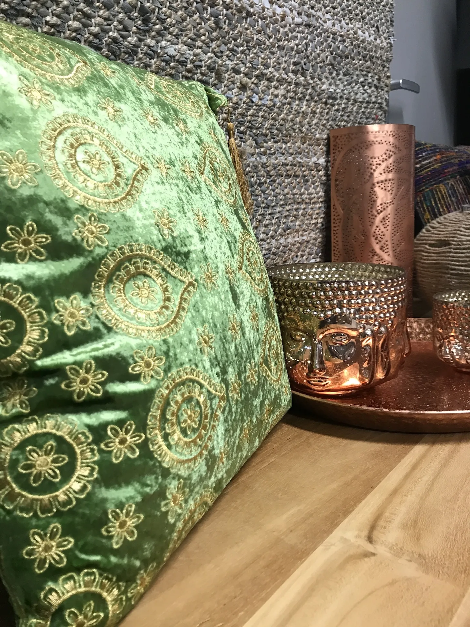 Warm groene kleur heeft dit fluwelen indiase sierkussen met goudkleurige kwasten aan elke punt voor het echt bohemian gevoel op de bank. Ook op het bed sierlijk om neer te leggen en aangenaam zacht om tegenaan te kruipen. Het gouden stiksel is er met de hand op genaaid in een oosters patroon. Het kussen is inclusief vulling en in diverse kleuren zodat u er ook een paar bij elkaar kunt zetten op de bank voor een 1001nacht gevoel te creeeren.