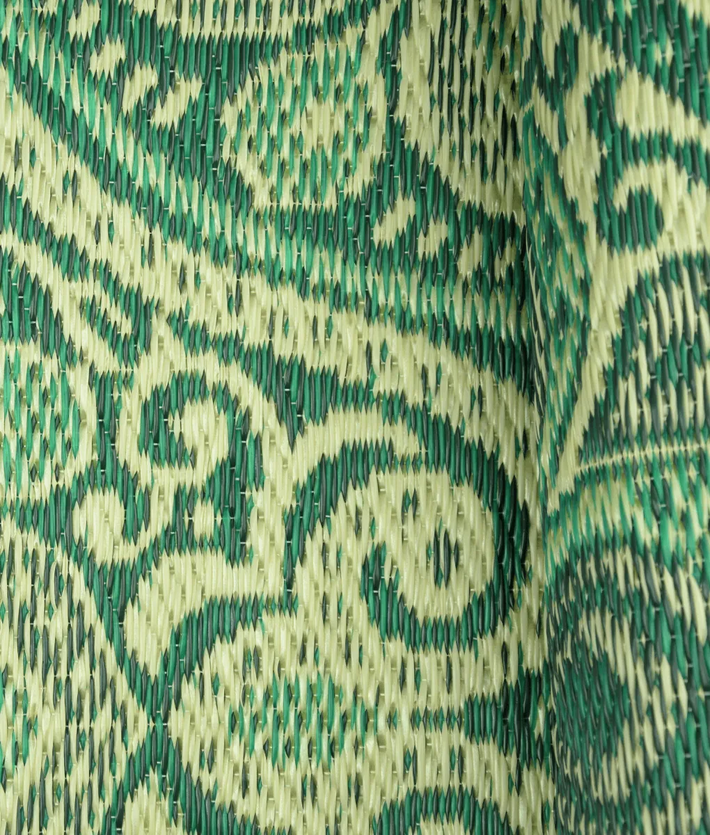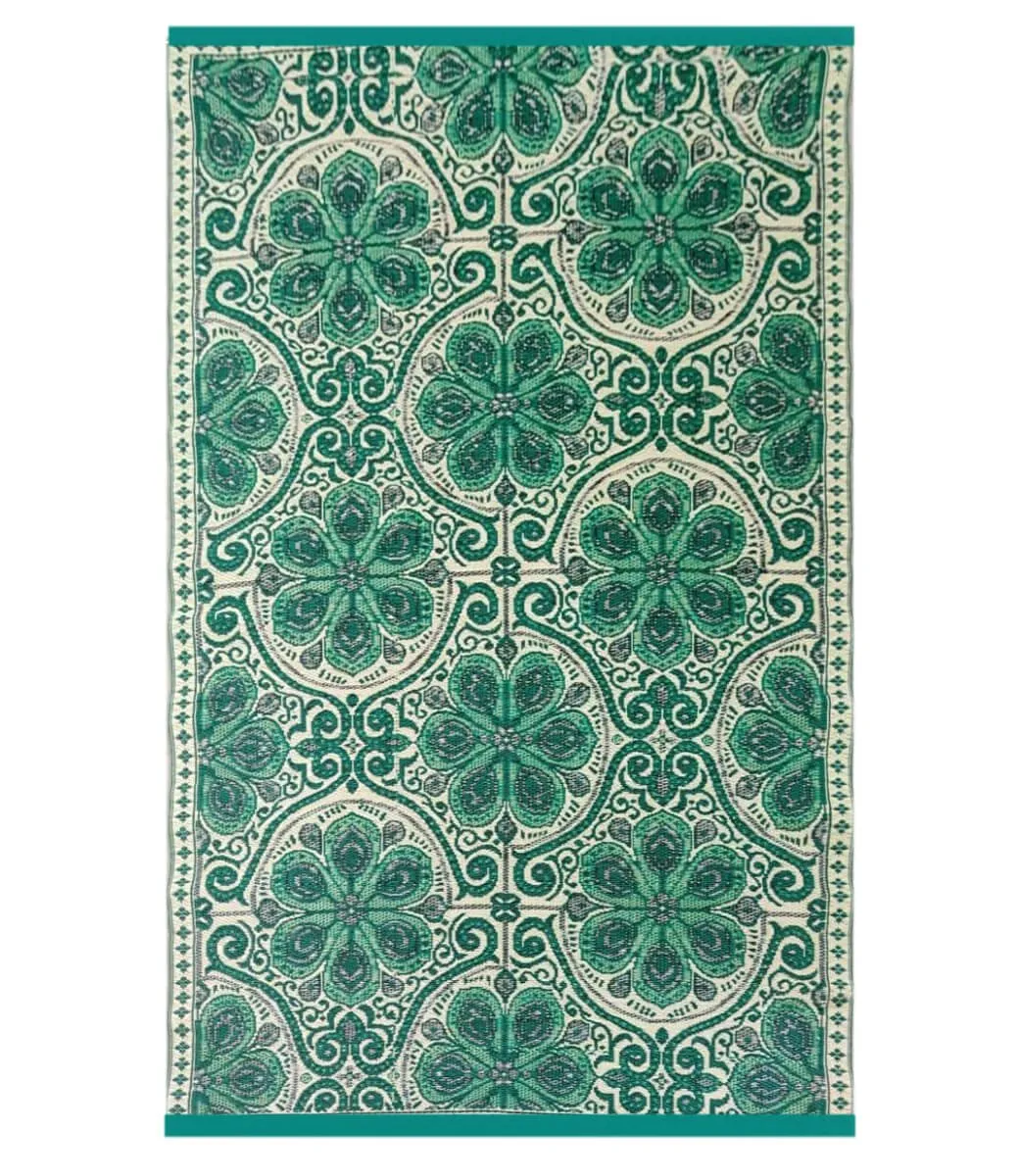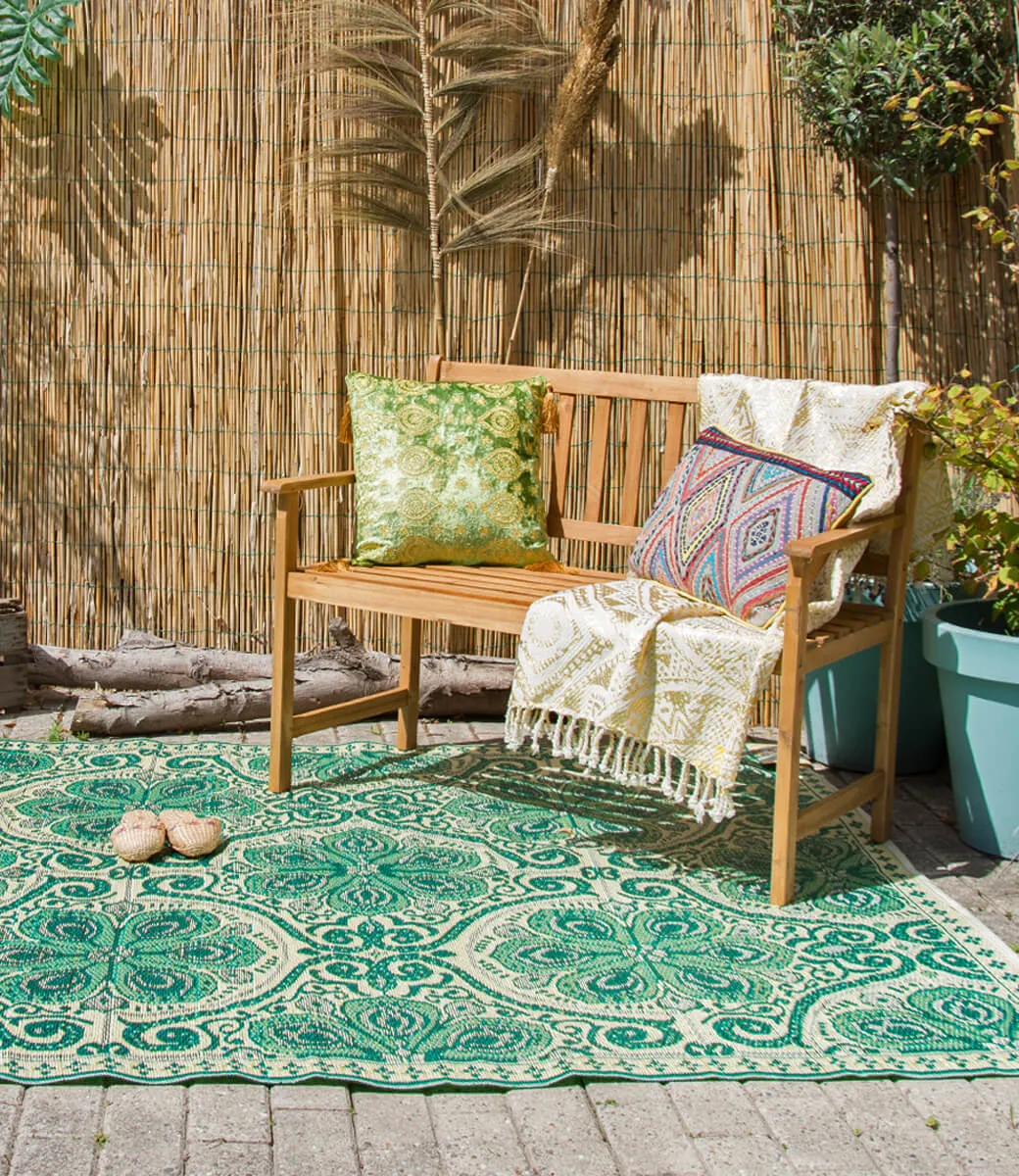 Orientaals patroon zit er in dit buitenkleed in 2 kleuren groen met goud welke prachtig staat bij een groene tuin met veel planten.Lees meer