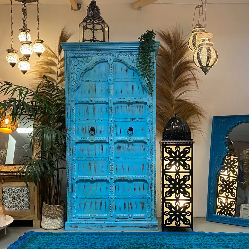 Stijlvolle robuuste blauwe vintage kast in oosterse sfeer van zwaar mangohout. De kleur is diepblauw en old style gemaakt zodat het authentiek uitstraalt en sfeer geeft in uw interieur. Op de deuren zt zwart metaal beslag wat mooi afsteekt op het blauw. Er zitten vaste legplanken in waarin je veel spullen in kwijt kan.