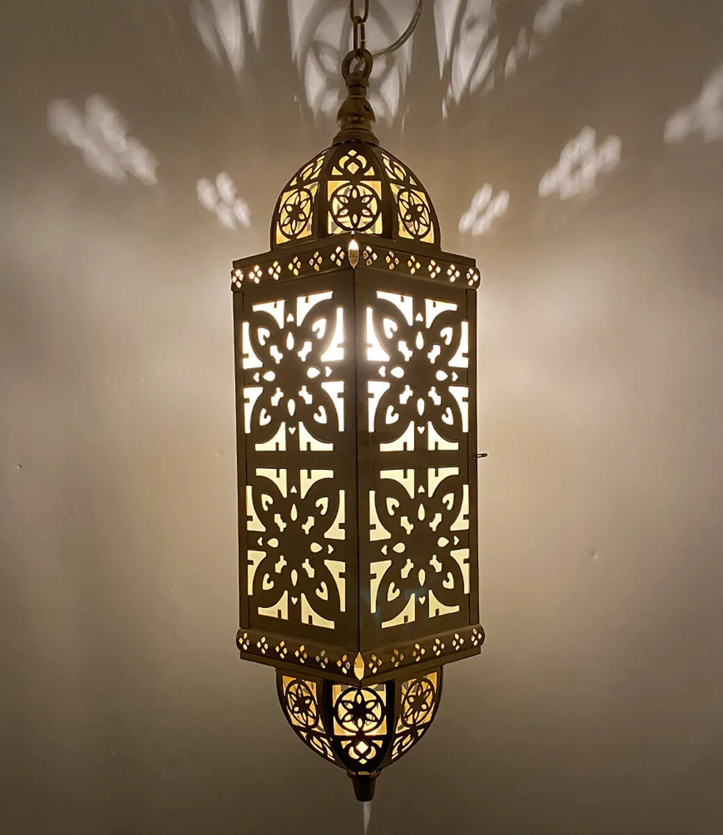 Waan u in de wereld van 1001nacht met deze mat gouden oosterse hanglantaarn. Deze handgemaakte oosterse hanglantaarn is op fair trade basis gemaakt van metaal. De oosterse lantaarn geeft een warm en gezellig licht door het verfijnd oriëntaals design en het mooie matte goud. Warme sfeer geeft deze lamp overdag en in de avond als al de mooie patronen doorschijnen. Deze zijn er met de hand in gemaakt in India. Het is gemaakt van zacht metaal en behoeft geen onderhoud zoals poetsen.