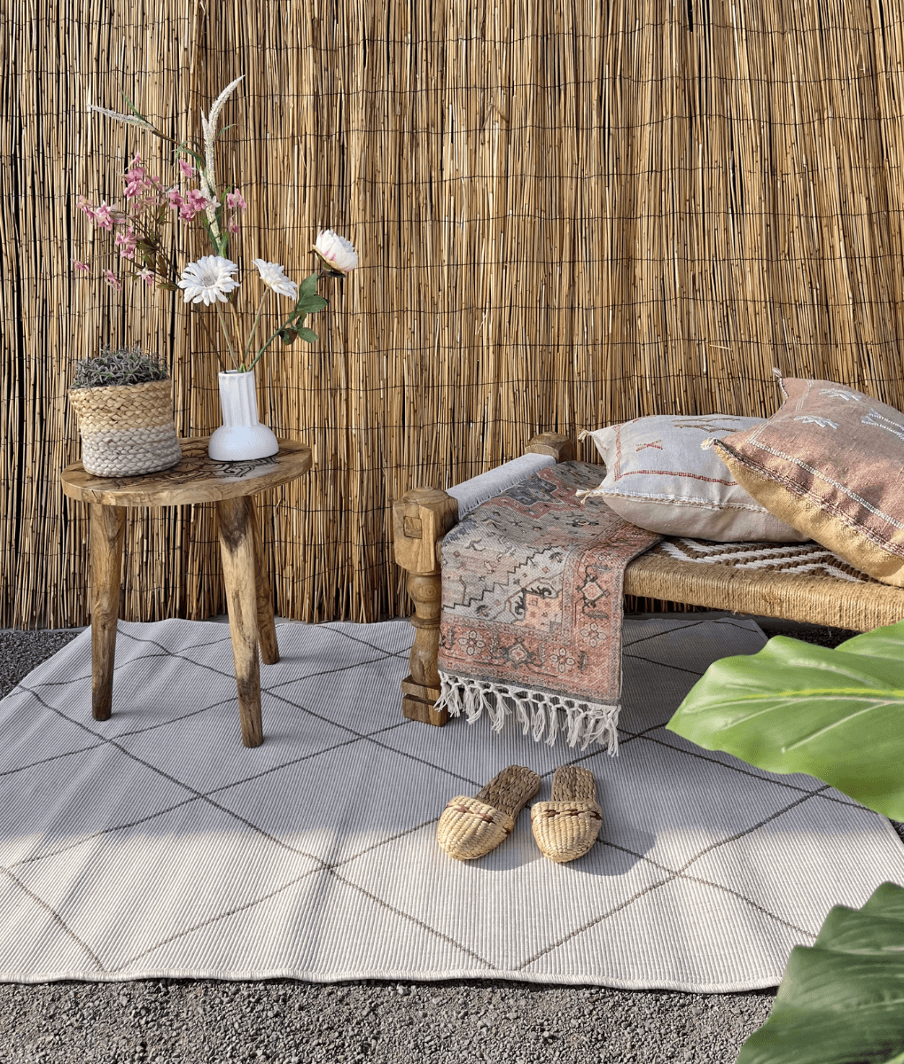 Marokkaans berber look buitenkleed in jute look materiaal speciaal om buiten in de tuin als vloerkleed te gebruiken. Het kleed is aan beide kanten te gebruiken zodat je of de crème kant met zandkleurige strepen ziet of juist de zand kleur met crème patroon a la Beni quarain. In 3 maten te verkrijgen en makkelijk op te rollen. Het vloerkleed is makkelijk met water schoon te maken en kan binnen als buiten gebruikt worden. Het kleed is gemaakt van milieuvriendelijk kunststof vezels en heeft een natuurlijke glans. Heb je last van allergieën dan is polypropyleen ook een goede keuze, omdat dit geen vezels verspreid of stof aantrekt.