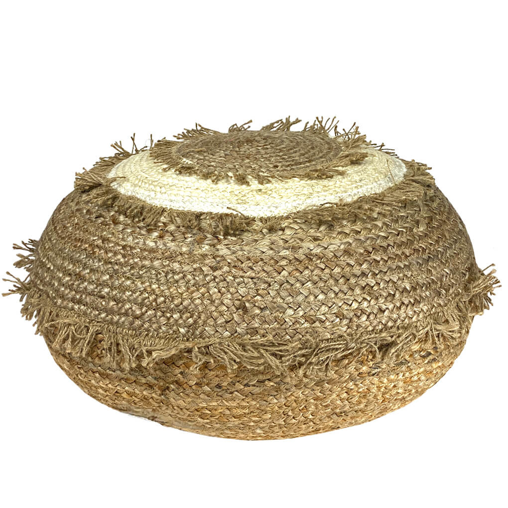 Gezellig poefje van naturel jute en een speelse witte rand erin en franjes. Goed gevuld, maar is niet zwaar en is handgemaakt in India. Deze poef draagt het care en fair label en is eerlijk gemaakt.
