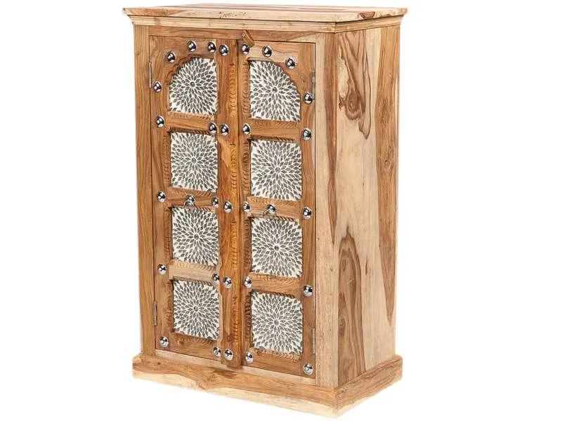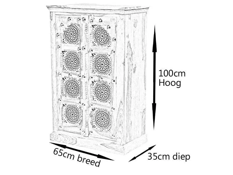 Gezellig kastje van sheesam hout en ingelegd glas mozaïek transparant in de 2 deuren. Oosters kastje staat leuk in elk interieur en geeft een oosterse sfeer. Bijvoorbeeld in de hal of als klein boekenkastje geschikt, er zitten houten planken aan de binnenzijde in om de spullen in op te bergen. Het is een handgemaakt kastje dus elk is uniek en heeft een mooie naturel nerf in het hout.