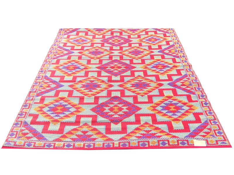 Kleurrijk sprekend tuincarpet voor buitengebruik van plastic in een heel gaaf patroon welke oosters is, maar eigenlijk allemaal grafische vormen erin verwerkt heeft. Op rol, niet gevouwen dus ligt vlak op de grond zonder lelijke vouwen of naden erin. Mooi afgewerkt met een rode bies, wat hem ook stoer maakt en lekker opvallend als je tuin wel wat kleur kan gebruiken. Oprolbaar en makkelijk schoon te maken met een sopje, dus knoeien met ijsjes in de zomer is geen enkel probleem. Het kleed weegt maar 2,5 kilo en berg je dus zo op op een droge plek in de winter, zodat je het jaar daarna ook weer gezellig buiten zit te genieten.