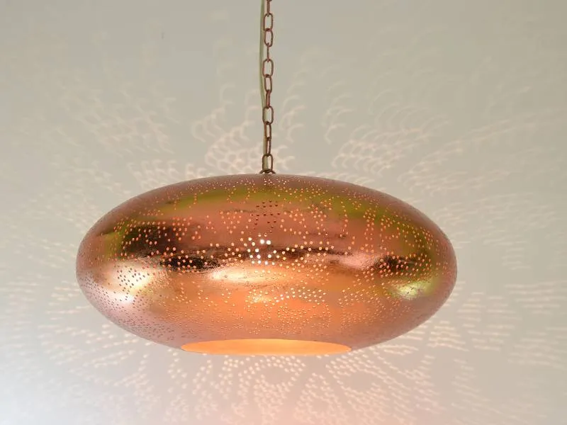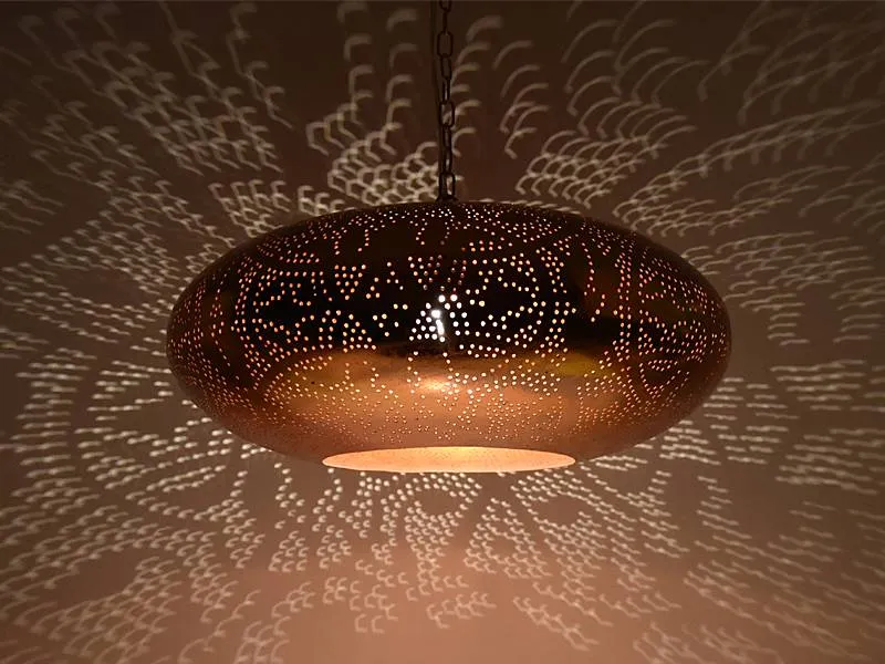 Er zit een ketting en een rond plafondkapje aan in dezelfde koperkleur zodat de lamp totaal koper is tot aan het plafond. Handgemaakt in India elk gaatje in met precisie erin gemaakt en al die ronde puntjes samen maken dat mooie oosterse effect op de muur en plafond. Dit model heeft een platte bovenkant en daardoor kunt u met dit model echt hele mooie lichteffecten op het plafond maken. Al die gaatjes projecteren een betoverend oriëntaals patroon met de juiste lamp.