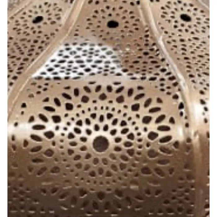 De kleur is koper met bloemen patronen en is een warm uiterlijk wat zeker sfeer aan uw interieur brengt. ALs u de juiste lamp erin doet kunt u zoals de foto's al laten zien er een prachtig sierlijk ornament van laten schijnen op het plafond. Op de foto staat de lamp als hij aan is. Er zit 1 fitting in E14 met max 40 watt.