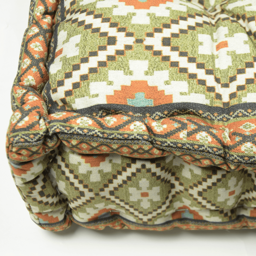 Vierkant matraskussen oriental met mooie combinatie kleuren creme, groen en oranje en een bloemenprint op het zachte stof. Het kussen is goed gevuld en van deze stof is er ook een armrol en een poef van om het een geheel te maken in de tuin of terras. De rollen, poef en matrassen zijn van dikke stof en zijn old vintage bedrukt.Zie de detail foto‚¬„¢s