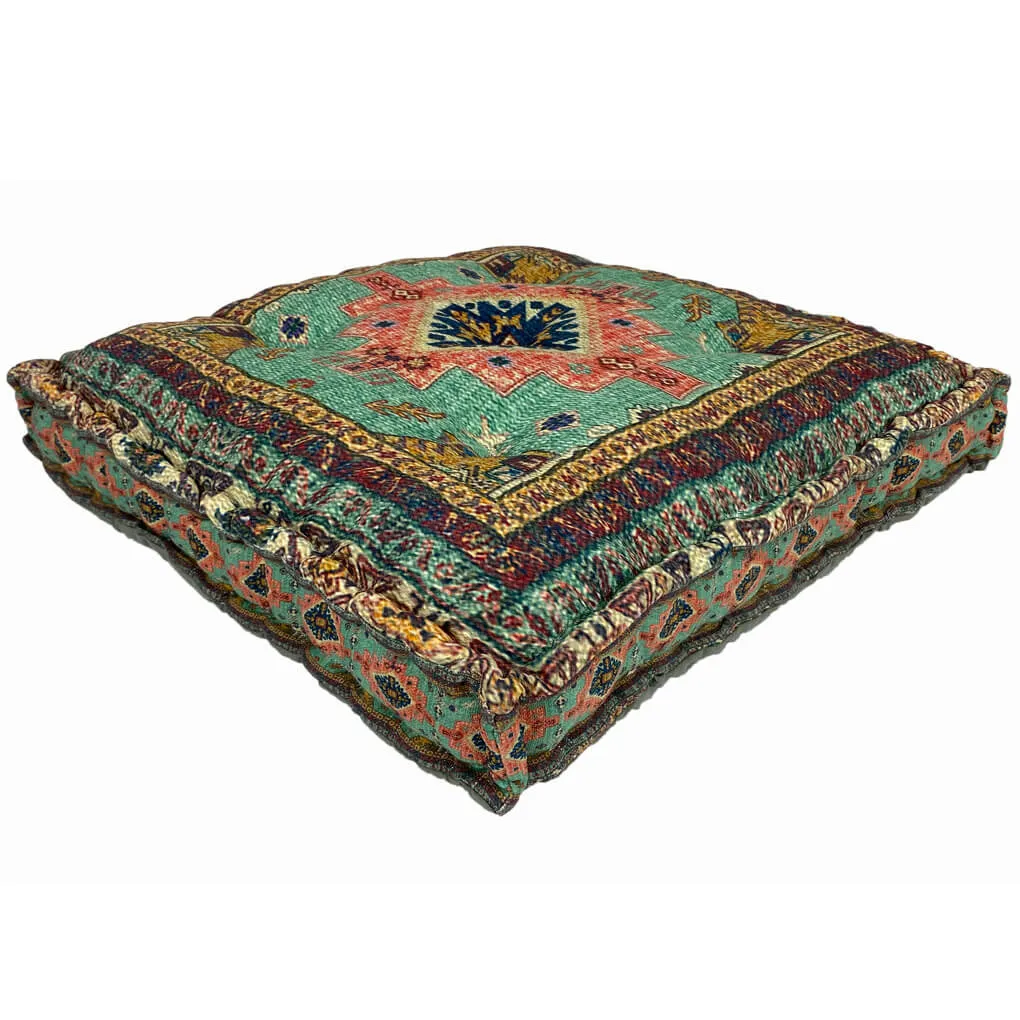 Vierkante 50 x 50 cm matraskussen met een gave kelim print erop om je eigen Marrakech buiten te maken. Mooie warme kleuren zitten erin en ze zijn goed gevuld om lekker lang op te loungen en te genieten.