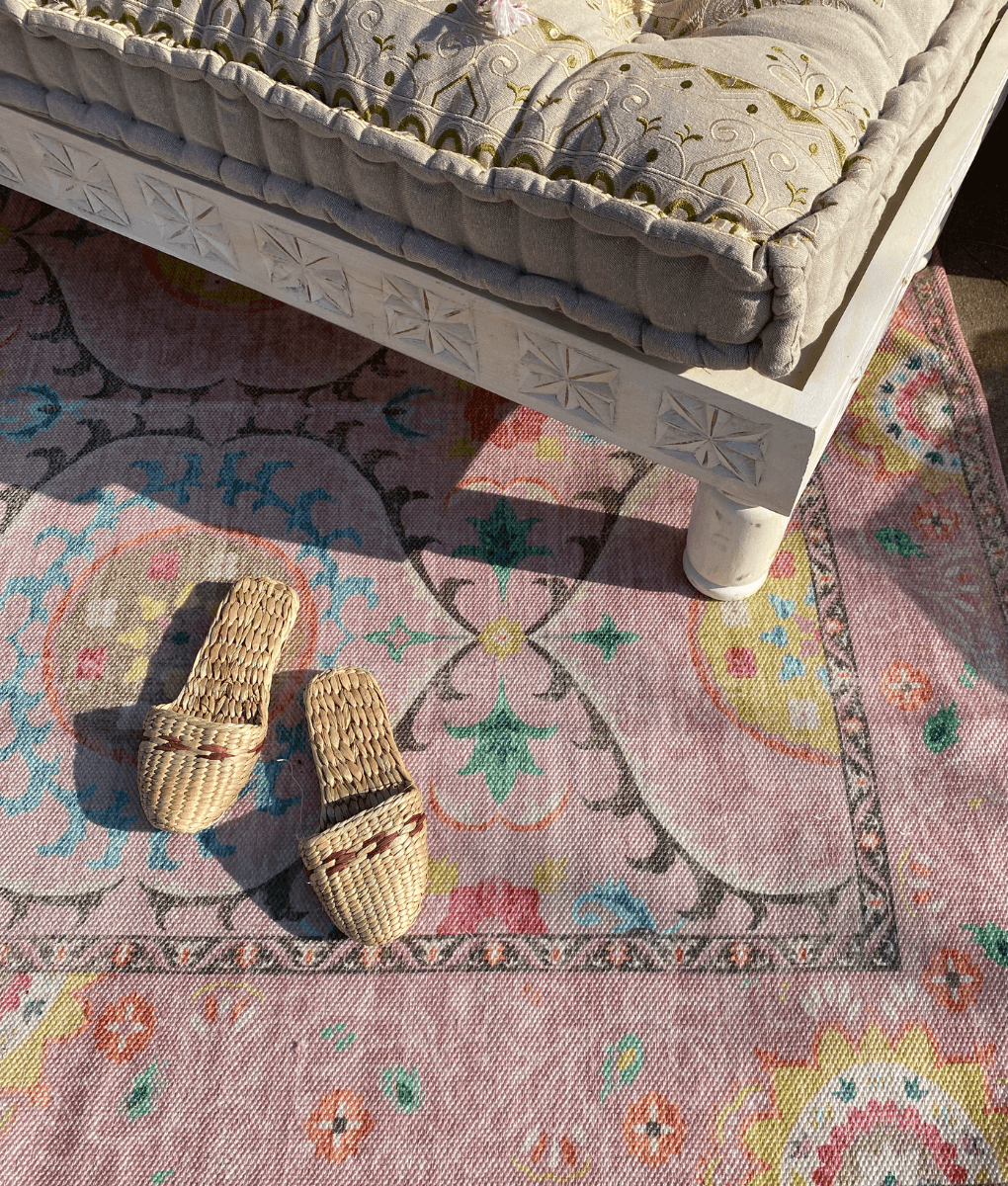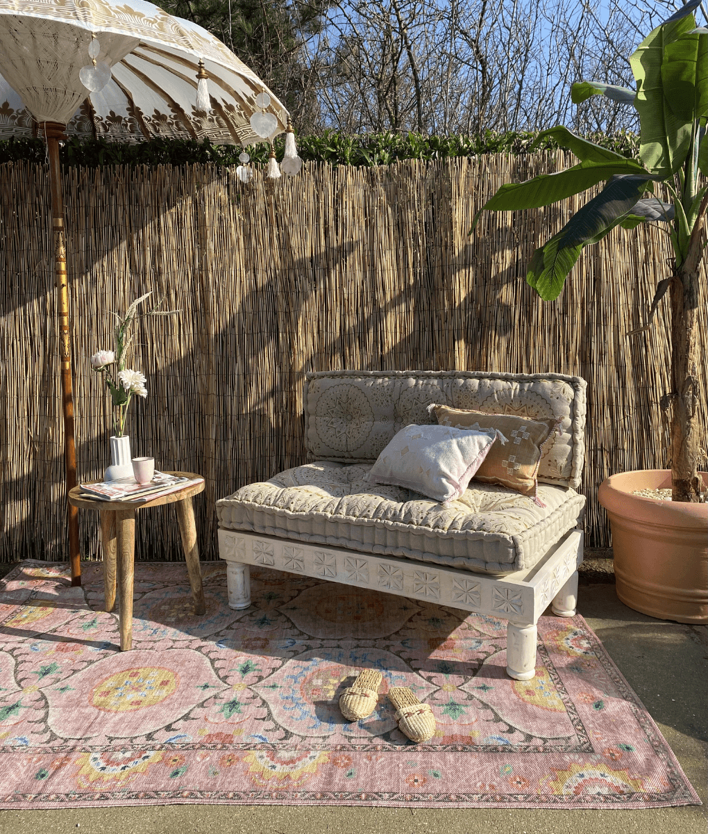 Wat een snoepje! Dit zacht roze buitenkleed met gekleurde bloemetjes erop geprint. Het is handgemaakt van PET en draagt het care en fair label. Ideaal voor buiten en zeker ook binnen , want het voelt aan als zacht katoen. In vele kleuren en maten te verkrijgen, speciaal ontworpen door Merel zelf.
