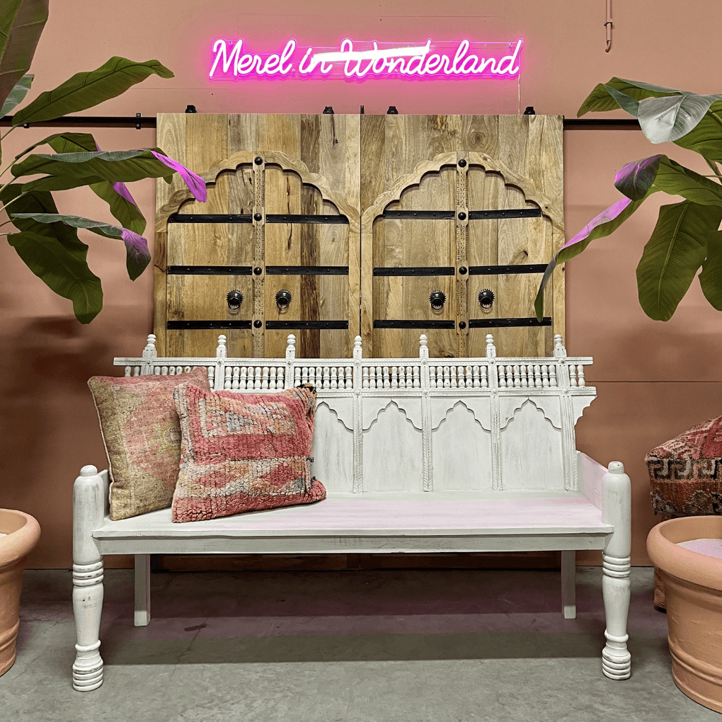 Dit bankje is met veel mooie details afgewerkt. Hier leent het mangohout, waarvan de bank gemaakt is, zich goed voor. Dit hout komt uit India. Hier is de bank ook met de hand gemaakt.