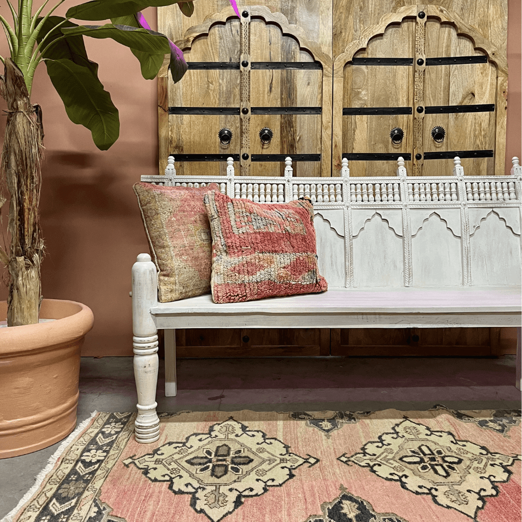 Het hout is van hoge kwaliteit en zal lang mooi blijven. Het is afgewerkt in een frisse witte kleur. De oosterse bank is 180 centimeter breed, 50 centimeter hoog en 10 centimeter diep.