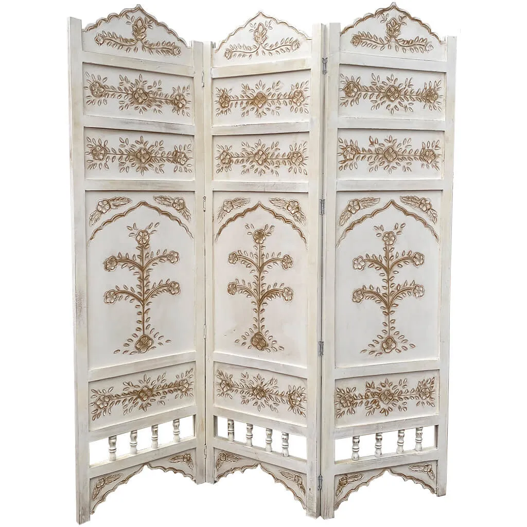 Een beetje privacy nodig in je huis is in deze tijd wel nodig met al dat thuiswerken. Misschien een mooie afrastering tussen je woonkamer en je kantoor in huis? Deze wit houten roomdivider of ook wel kamerscherm genoemd is werkelijk een plaatje in het interieur. Er zit heel veel houtsnijwerk in deze 3 panelen en hij is van zware kwaliteit uit India. Let op, dit kamerscherm kan alleen afgehaald worden in de showroom.