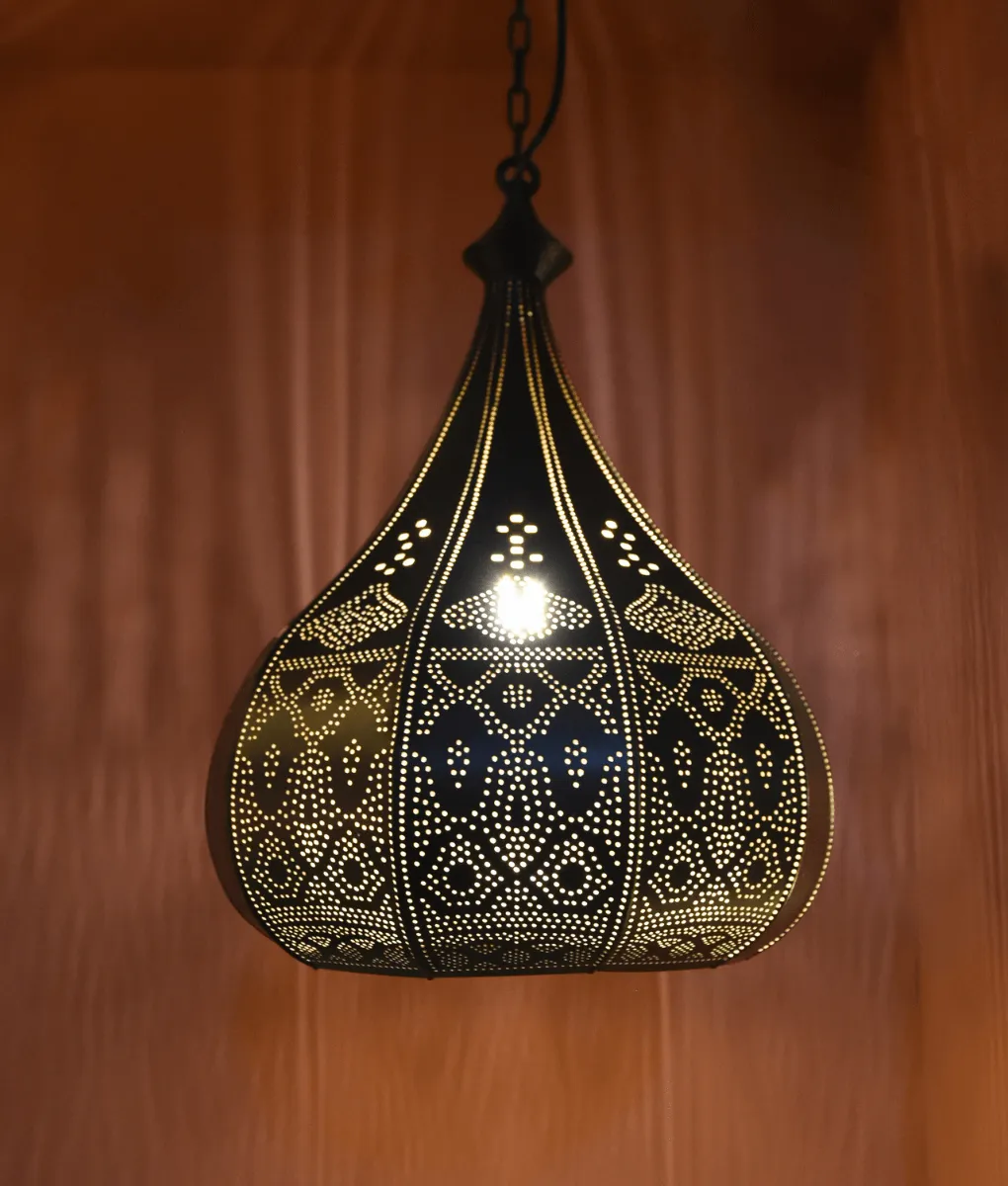 Deze sprookjesachtige hanglamp in een kelkvorm is voorzien van een prachtig patroon, die verschijnt op de muren zodra de lamp aan gaat! De lamp heeft een zwarte buitenkant en een sfeervolle gouden binnenkant. In de lamp zitten allemaal kleine gaatjes welke mooi doorschijnen in de avond.