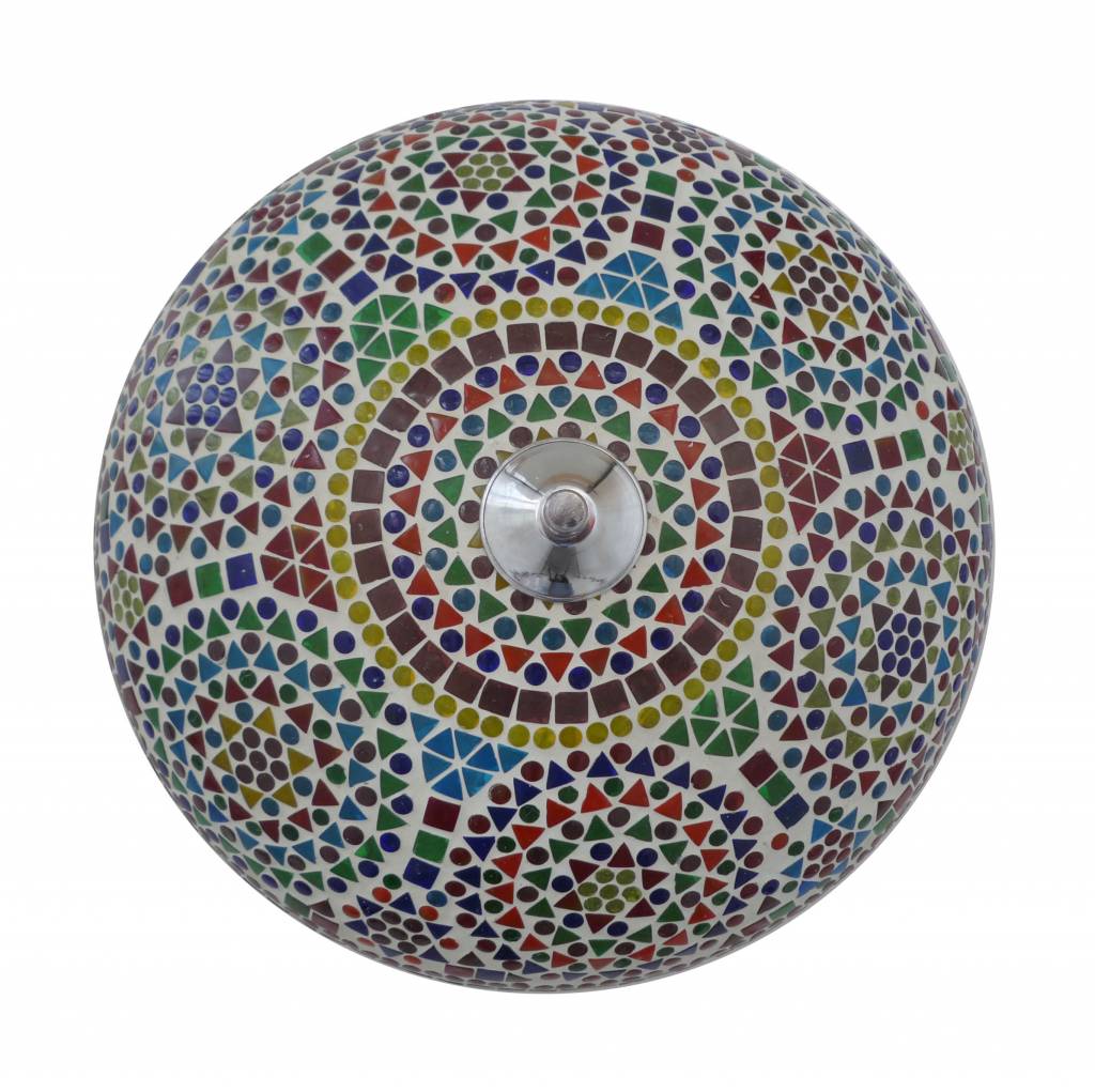 De oosterse lamp met multicolour glasmozaïek is handgemaakt uit India. Deze lamp bestaat uit sprankelende multi colour kleuren glas mozaïek zoals rood, groene, oranje, blauw, groen en nog meer kleuren. Dit maak het tot een prachtige oosterse sfeer plafondlamp en een kleurrijke lamp. Op de laatste foto staat de lamp afgebeeld als hij uit is en daar zie je dat de plafonnière gemaakt is van wit voegsel met daarin ingelegd mozaïek in een oosters patroon.