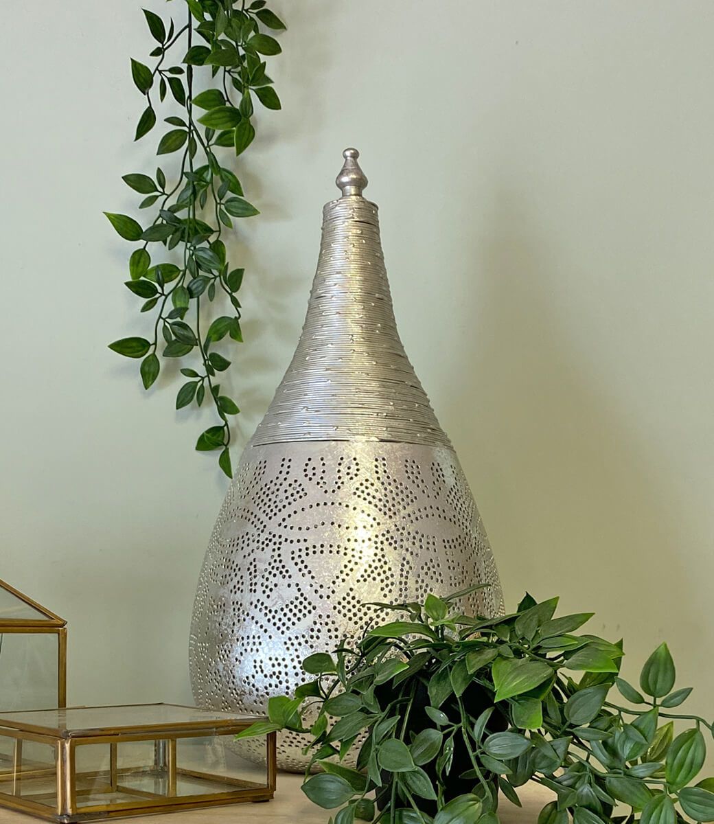 Speelse tafellamp in oosterse sfeer met een twist aan de bovenkant waar gedraaid metaal is gelast. Met de orientaalse filigrain onderkant van de lamp is dit een heel mooi effect bij elkaar. De kleur is vintage zilver zodat de lamp glimmende gedeeltes heeft afgewisseld met mat ertussendoor. Aan de bovenkant zit een sierlijk puntje.