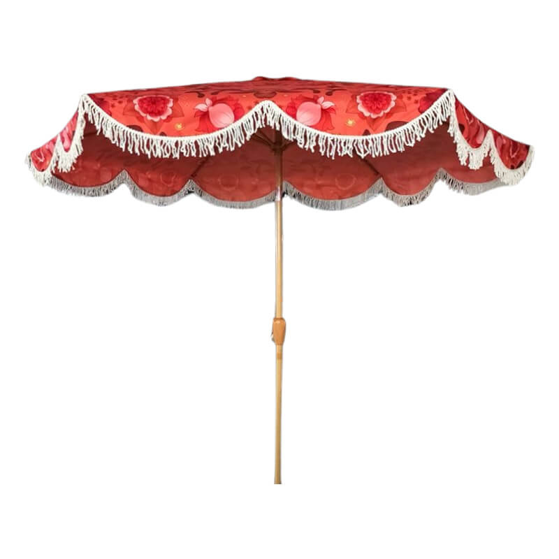 Parasol peacefull roze met een enorme print van bloemen erop zodat het een vrolijke mix is om buiten op te vrolijken. De parasol is lekker groot van formaat namelijk 2,70 doorsnee zodat de schaduw omgeving fijn is om in te zitten op warme dagen. Natuurlijk is ook deze print een eigen ontwerp van Merel in Wonderland en er zit een makkelijk draaibaar mechanisme in het midden om hem uit en in te klappen.