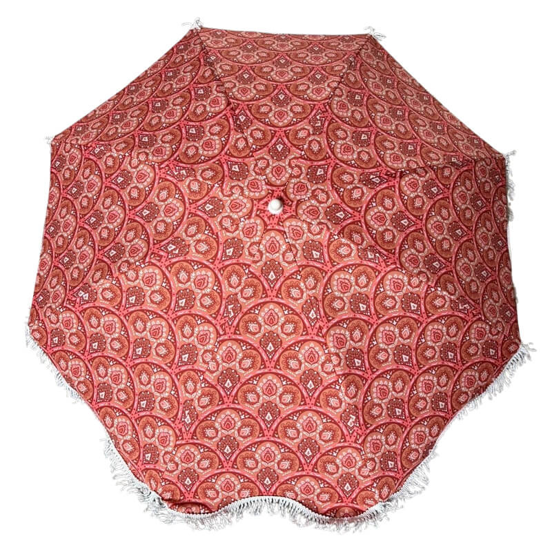 Parasol terra festival met een waaier print erop zodat het een vrolijke mix is om buiten op te vrolijken. De parasol is klein van formaat voor ook op het balkon te zetten. Je kunt hem ook meenemen naar het strand zodat het fijn is om lekker in de schaduw te zitten op warme dagen. Natuurlijk is ook deze print een eigen ontwerp van Merel in Wonderland.