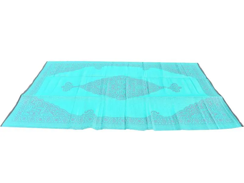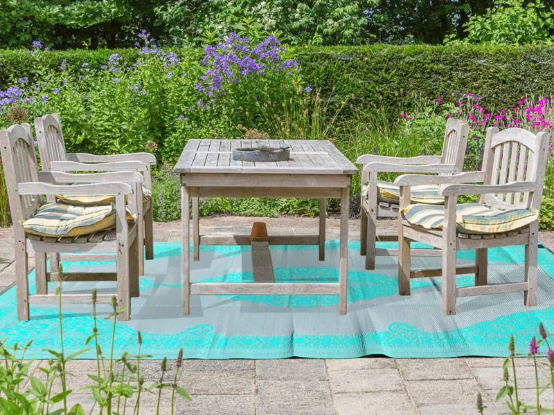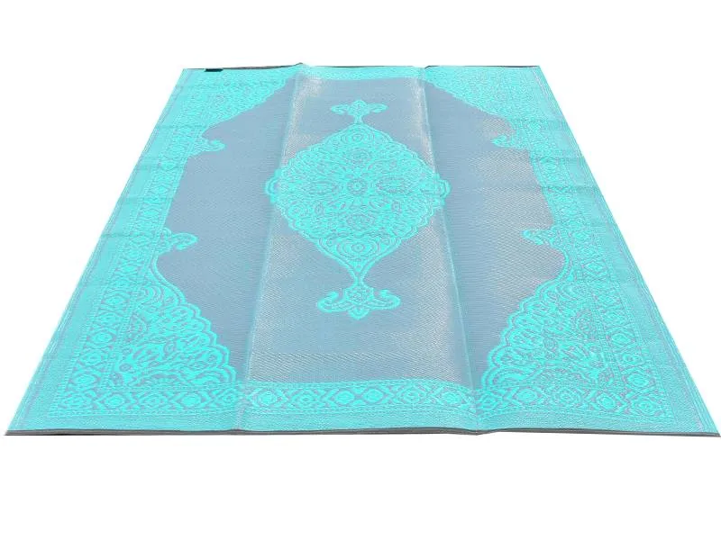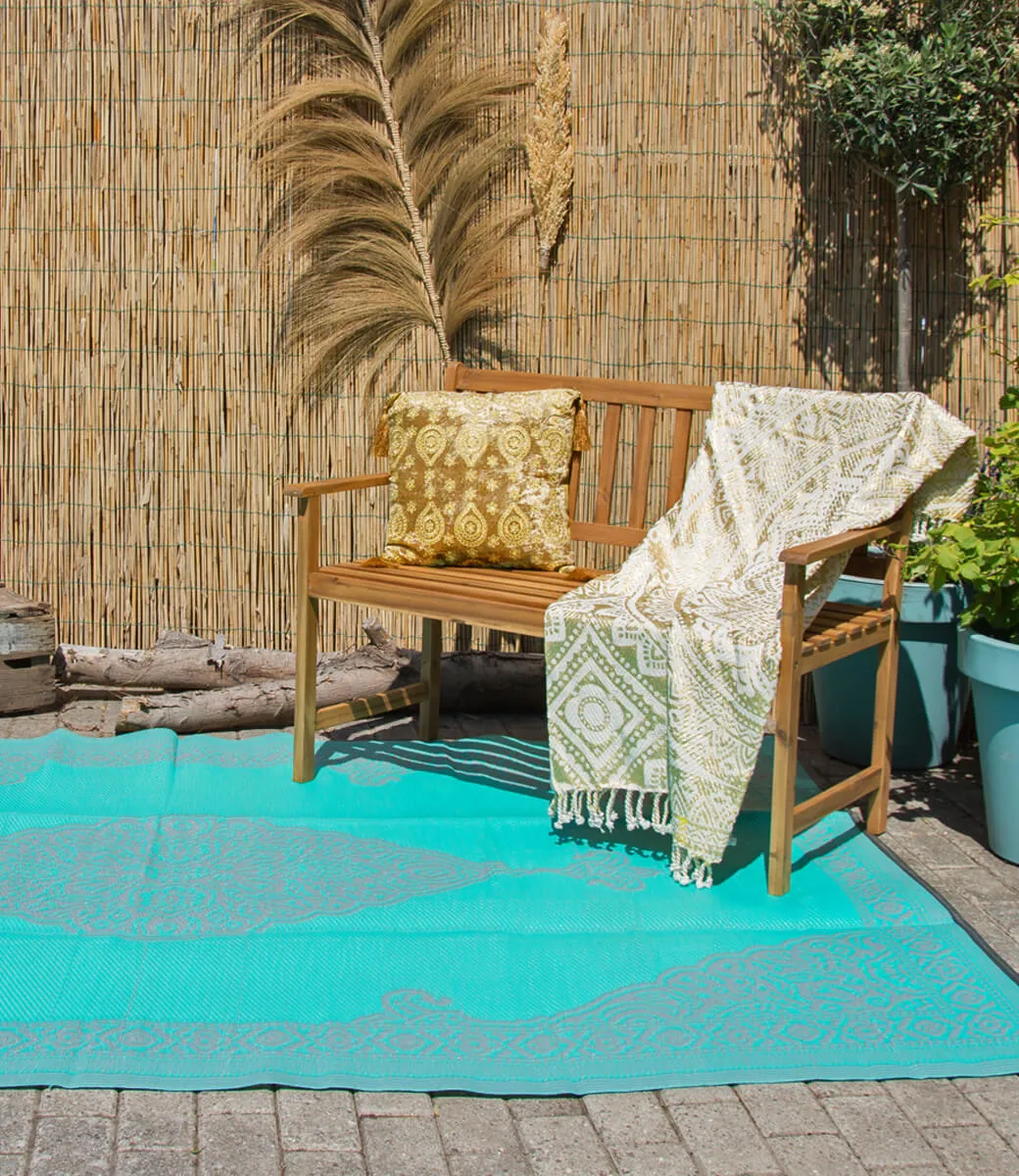 Komt zo aanwaaien uit een sprookje als uit 1001nacht, dit 1001% gerecycled buitenkleed is gemaakt van plastic. Het kleed is dubbelzijdig te gebruiken voor in de tuin, dus u kunt kiezen of u meer grijs of turquoise naar voren wilt laten komen in de tuin of terras. Makkelijk met een vochtige doek te reinigen en oprolbaar, hij weegt maar 2 kilo.Het kleed wordt gevouwen opgestuurd en als de zon erop gaat schijnen en het plastic warm wordt ziet u vanzelf dat de naden minder zichtbaar worden en het kleed platter gaat liggen.