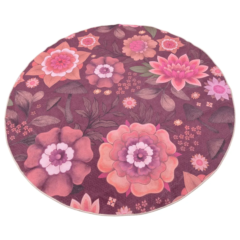 Kunst op de vloer! Dat is hoe je dit fleurige vloerkleed het beste kunt omschrijven, voorzien van een bordeaux kleurige achtergrond en vele mooie bloemen en paddenstoelen.