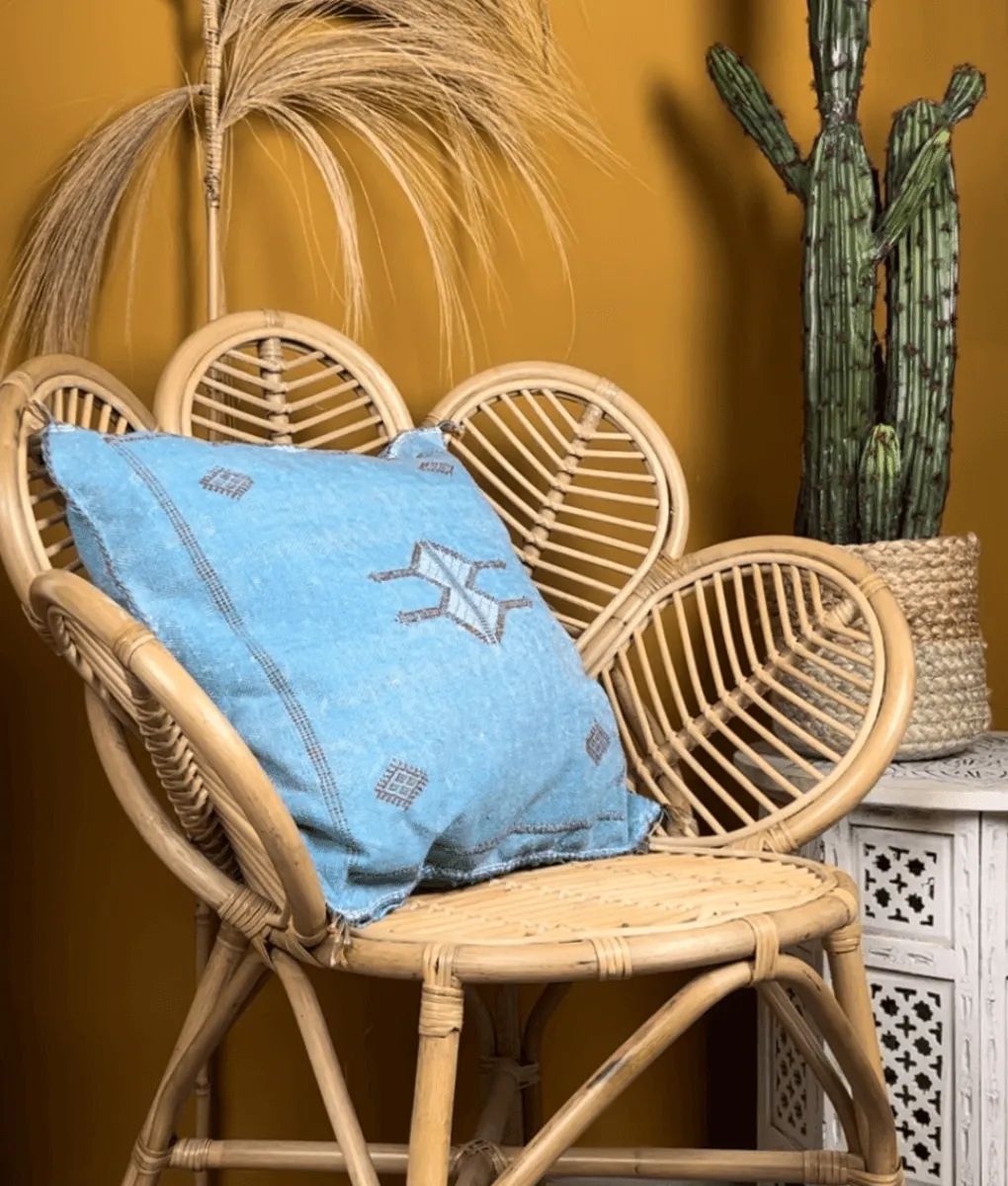 Vegan blauw sabra kussentje voor op de bank met speelse stiksels erop en kwastjes aan elke punt. Fijn zacht kussentje om ook in de zomer van te genieten, het zijn zomerse lieve pastel kleuren. Elke kleur is uniek omdat het met de hand een kleurbadje krijgt. Het kussen wordt gemaakt van Sabra-vezels, een zachte, zijdeachtige stof verkregen van de Aloë Vera cactus-plant. De lange, puntige bladeren van de cactus worden geplet, de vezels gewassen en gehamerd, waarna de bladeren in water worden gedrenkt. De vezels worden gesponnen en een rol garen van gemaakt. De kleuren bestaan uit volledig natuurlijke kleurstoffen zoals saffraan, indigo en henna. De kussens worden met de hand gemaakt met een stevige rits door vakmensen uit Marokko.