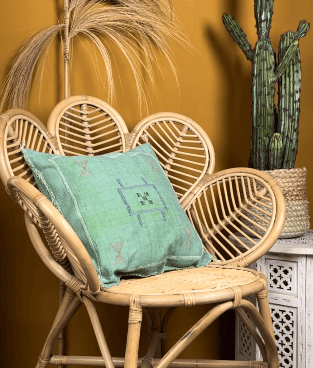 Vegan groen sabra kussentje voor op de bank met speelse stiksels erop en kwastjes aan elke punt. Fijn zacht kussentje om ook in de zomer van te genieten, het zijn zomerse lieve pastel kleuren. Elke kleur is uniek omdat het met de hand een kleurbadje krijgt. Het kussen wordt gemaakt van Sabra-vezels, een zachte, zijdeachtige stof verkregen van de Aloë Vera cactus-plant. De lange, puntige bladeren van de cactus worden geplet, de vezels gewassen en gehamerd, waarna de bladeren in water worden gedrenkt. De vezels worden gesponnen en een rol garen van gemaakt. De kleuren bestaan uit volledig natuurlijke kleurstoffen zoals saffraan, indigo en henna. De kussens worden met de hand gemaakt met een stevige rits door vakmensen uit Marokko.