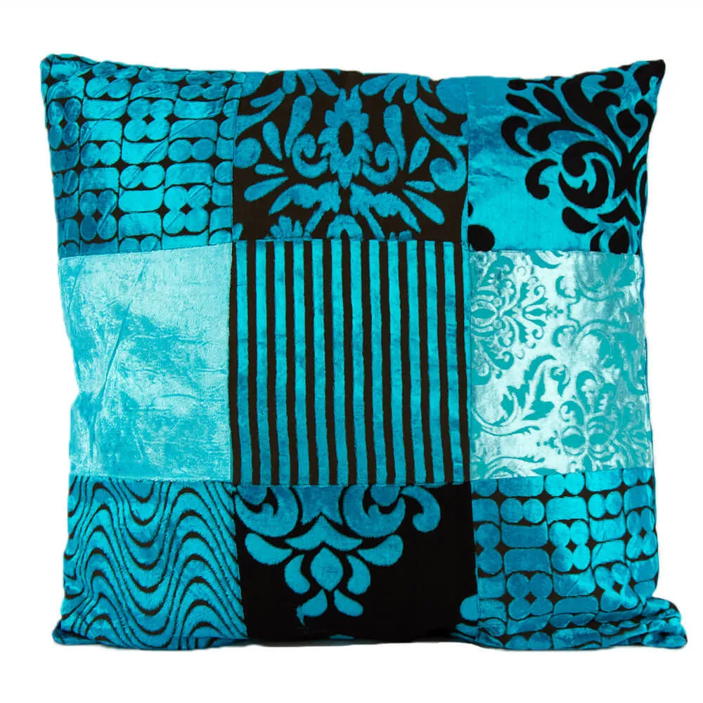 Vierkant turquoise patchwork kussen van 45 cm en lekker gevuld om direct van te genieten thuis op de bank. De kleuren zijn fris helder turquoise/blauw en met een sierlijke patchwork print erop. De stof is lekker behaaglijk zacht als fluweel en u kunt van deze serie ook nog andere sierkussens, armrollen en matraskussens aanschaffen om zo een bank vol te maken om heerlijk in te ploffen.
