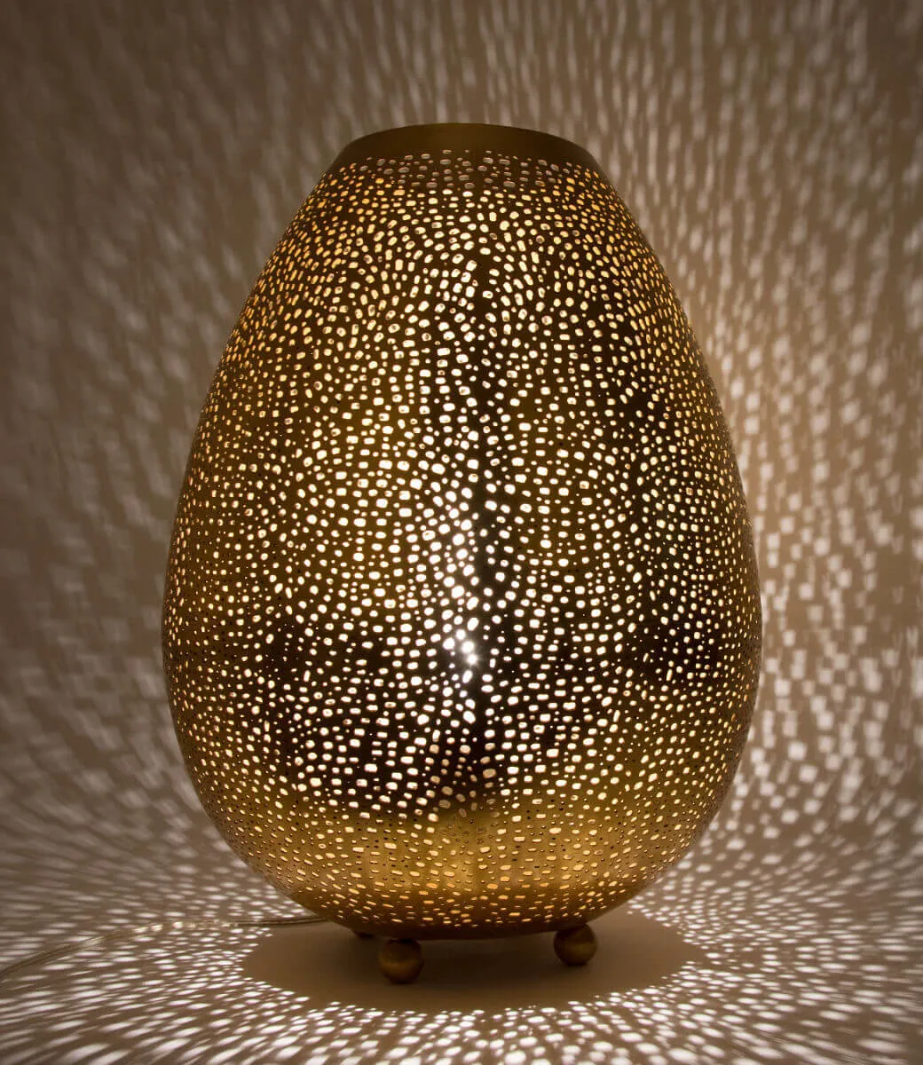 Je kan ze niet meer uit een interieur denken de oosterse tafellamp. Dit komt doordat als u eenmaal deze oosterse tafellamp in uw slaapkamer of juist huiskamer neerzet, de sfeer nooit meer hetzelfde zal zijn. Het zal voortaan een sfeervolle sprookjesachtige ruimte zijn die zonder dat de kachel aan staat toch een tikje warmer zult zijn. En dat allemaal door de zeer mooie gouden kleur aan de binnenkant met het bewerkte metaal wat werkelijk een 1001nacht sprookje is om naar te kijken. Creëer sfeer in huis met deze filigrain tafellamp.