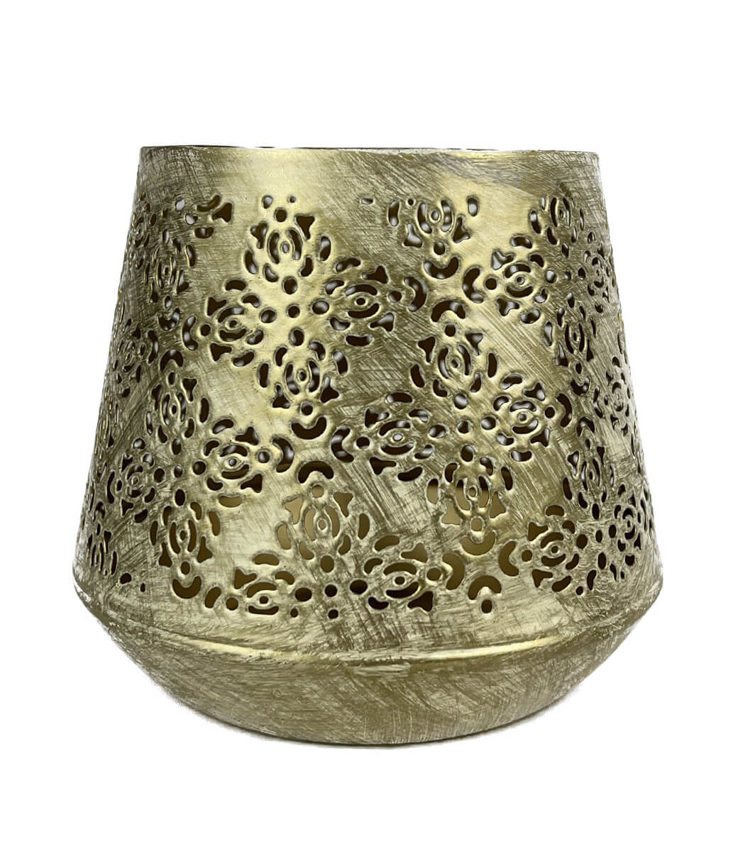Deze wonderschone waxinelichthouder is een prachtig statement piece voor elke ruimte. Door de patronen in het ijzer verschijnen er prachtige patronen op de muur. Dit wonderlijke effect maakt een ruimte helemaal af. Het waaierpatroon is uniek en handgemaakt in India. Het theelichtje is helemaal wit met goud en heeft een stoere vintage finish.