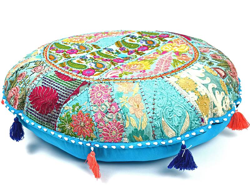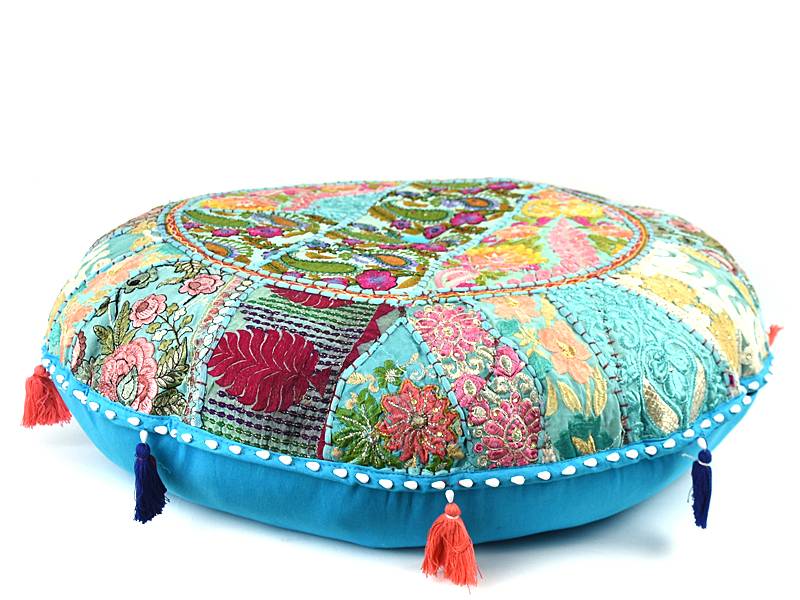 Blauw katoen groot rond vloerkussen met maar liefst een doorsnee van 70 cm. Hij is lekker stevig gevuld zodat hij niet doorzakt. Daarop gerecycled patchwork geborduurd in blauwe kleur en daarom is elk kussen uniek. De lapjes stof zijn afkomstig van oude sari's die de vrouwen in India dragen, deze worden gewassen en opnieuw gekleurd en krijgen zo een 2e leven.