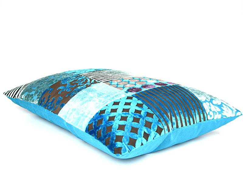 Turquoise sierkussen in de maat 60 x 40 cm inclusief vulling. Elk stukje stof heeft een ander patroon wat het erg speels maakt. In deze serie is ook een sierkussen vierkant en een armrol en een vloerkussen.