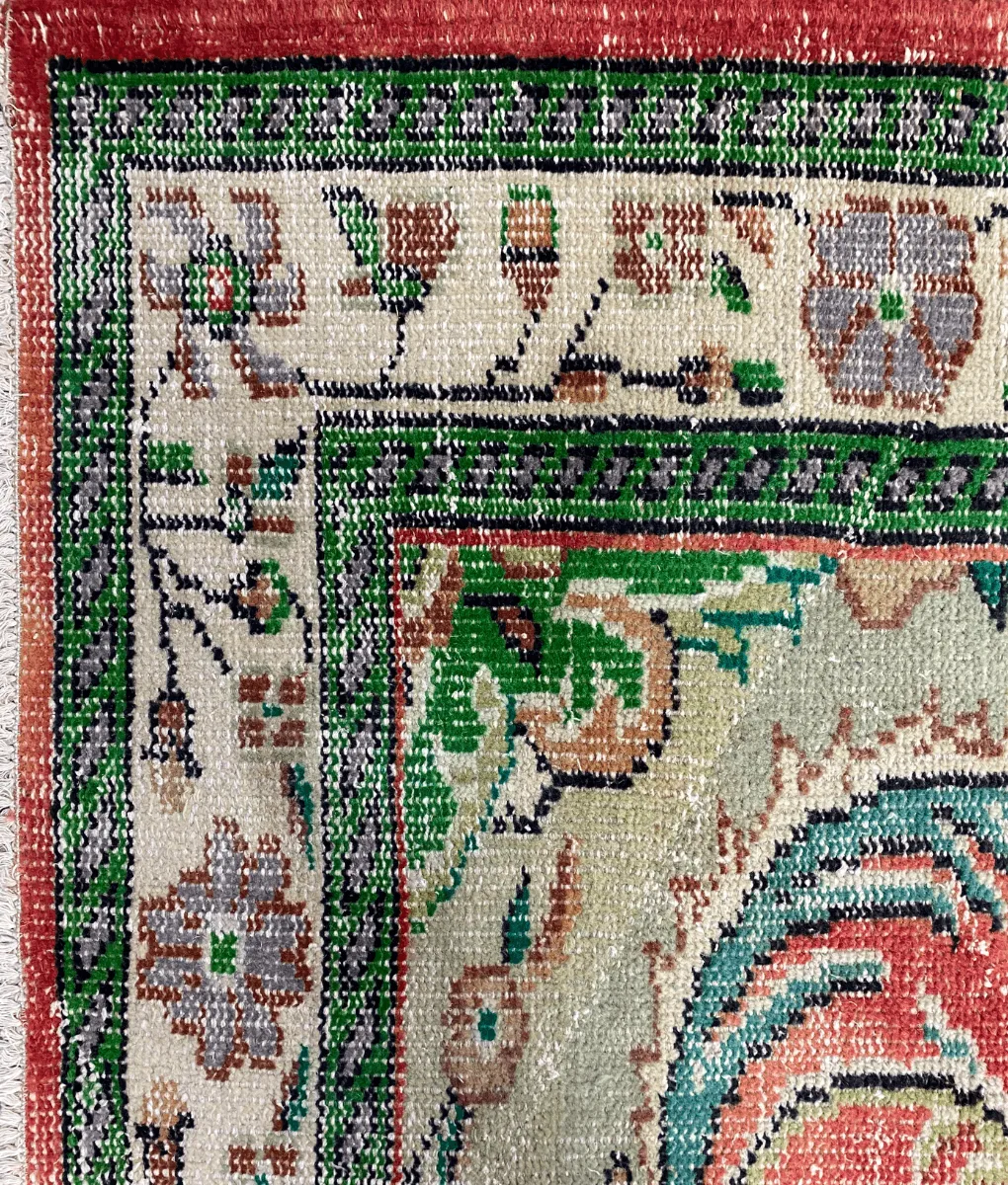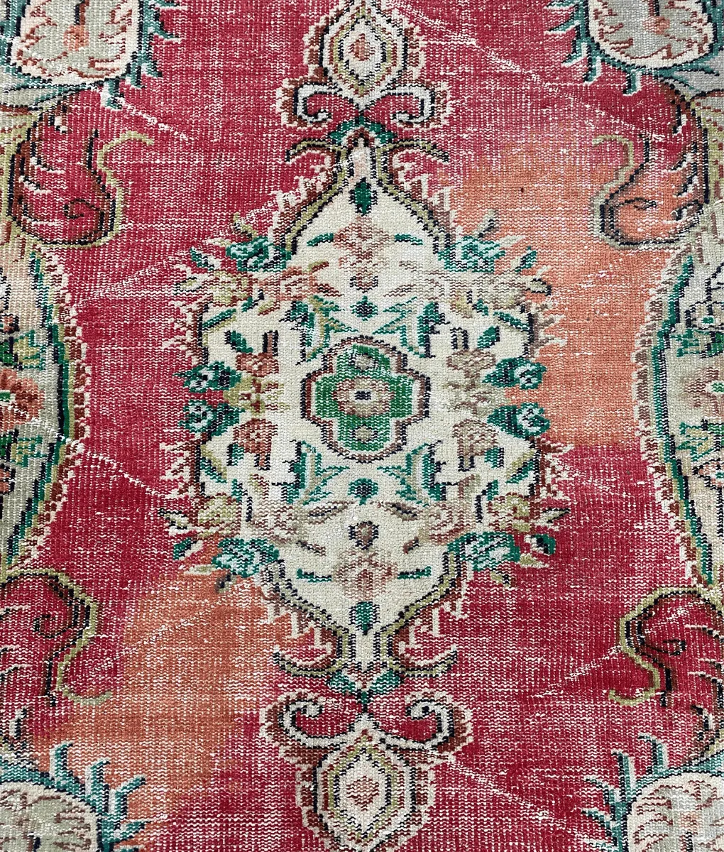 Kleurrijk vintage vloerkleed voorzien van een warme roze tint en groene accenten. Een echte eyecatcher in jouw woonkamer! Handgemaakt in Turkije, wij geven het kleed graag een tweede leven.