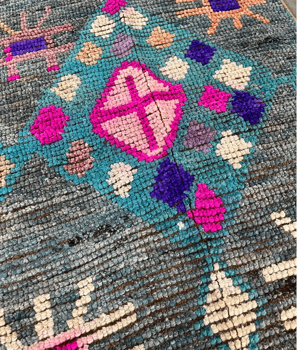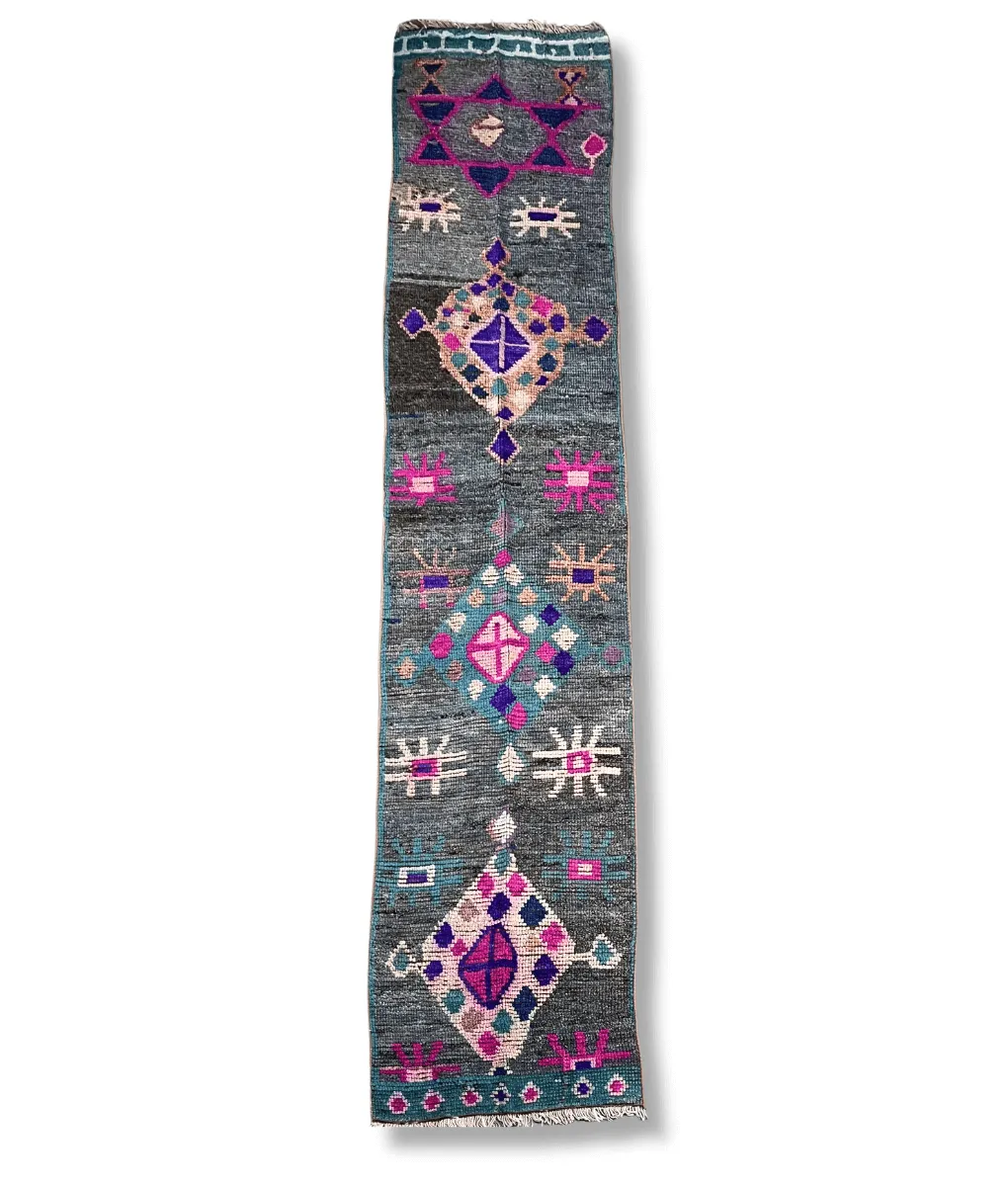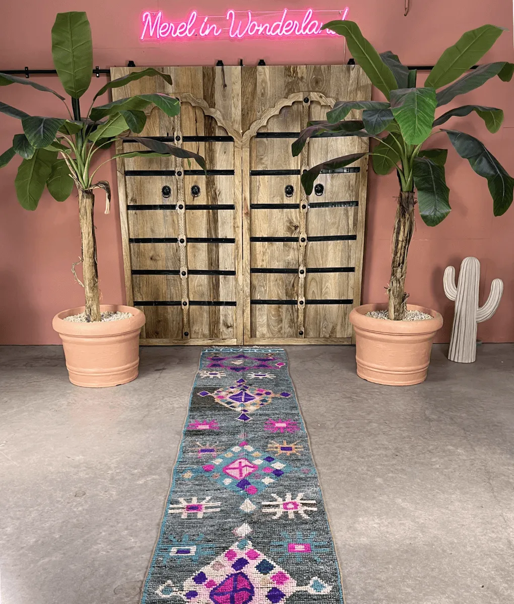 Een vintage loper voorzien van felle paarse tinten. Je hebt met deze loper een echt uniek pareltje in huis liggen!