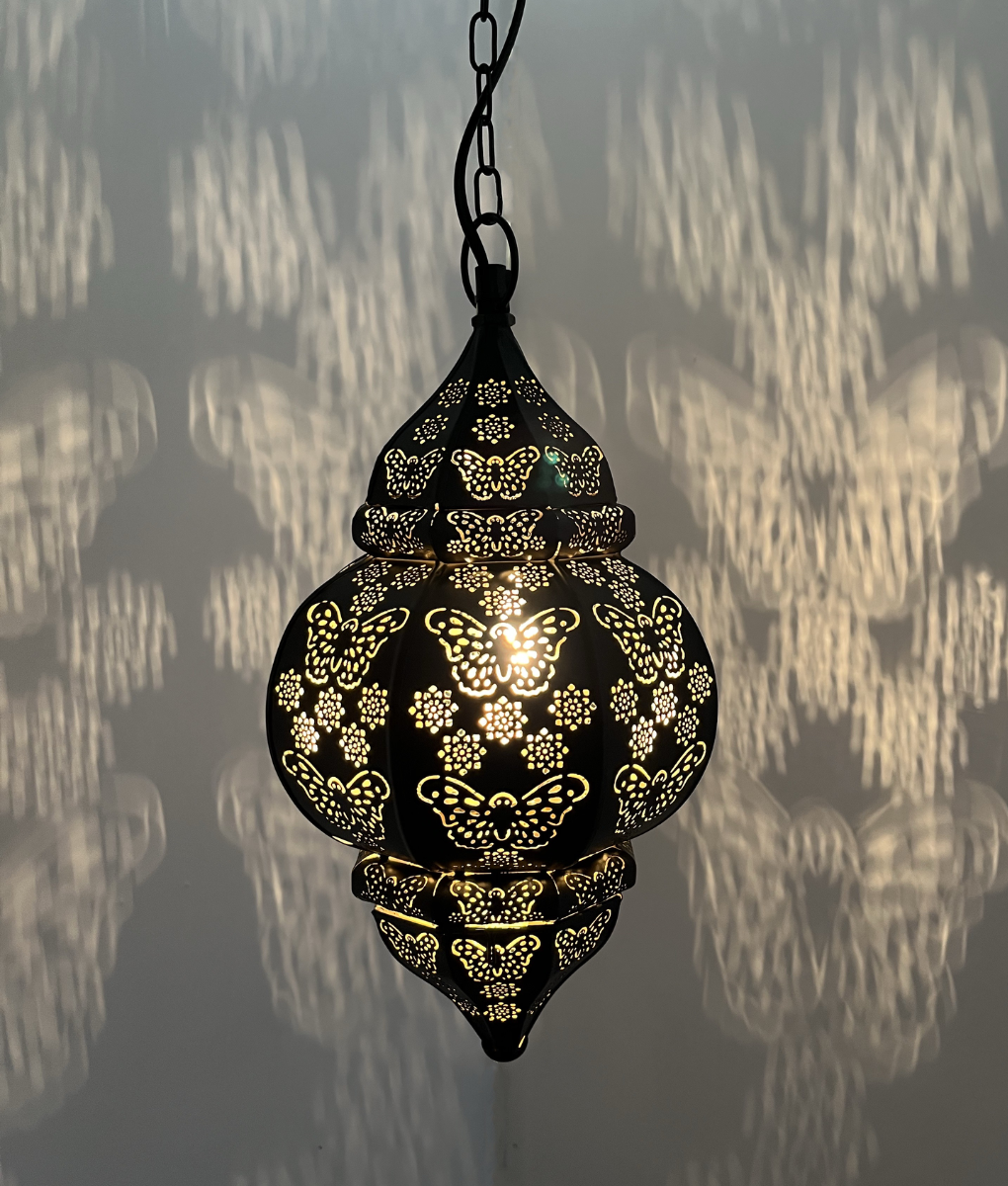 Wordt betoverd door het prachtige vlinderpatroon dat tevoorschijn komt zodra je de lamp aanzet. Deze hanglamp is voorzien van een zwarte buitenkant en gouden binnenkant met prachtige vlinders. Perfect voor in een kinderkamer of als sfeervol lampje in de woonkamer.