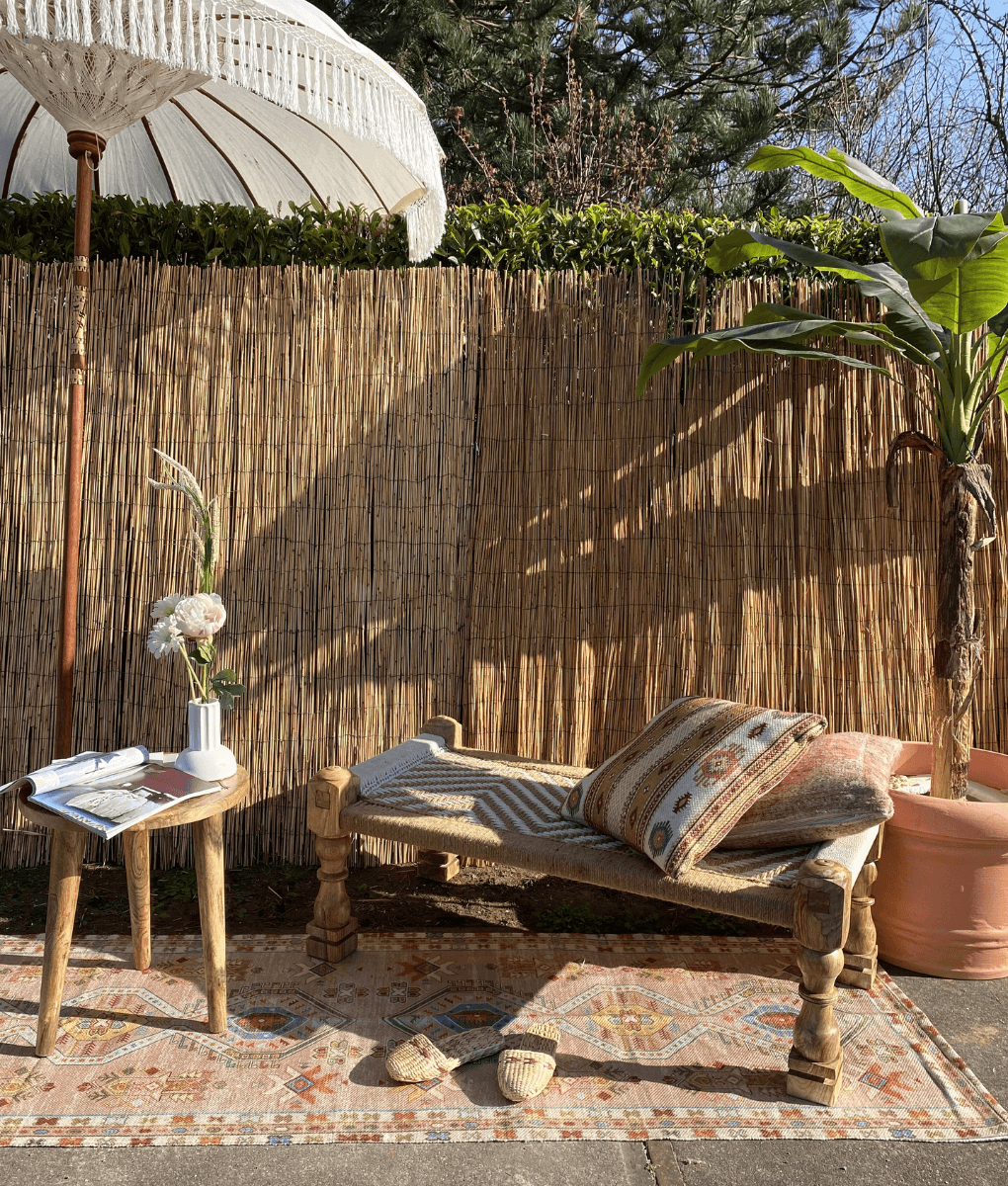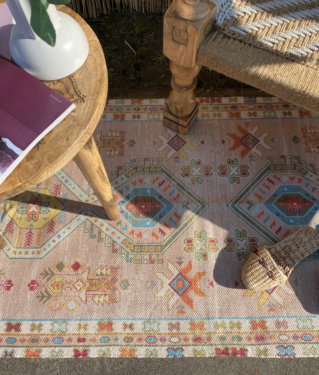 Dit mooie patroon heet 'Sunidhi' en is daarom rijk aan vrolijke kleuren, want de betekenis is rijkdom in India. Deze bijzondere print is gedrukt op Pet en dat voelt aan als stof alleen dit kan wel gewoon in de zomer gebruikt worden als balkonkleed. Het kleed kan nat worden, maar de zon droogt het zo weer op. Ook binnenshuis is PET makkelijk om als vloerkleed te gebruiken. Multi functioneel vloerkleed is deze loper van 80 x 240 cm. Ook in blauwe kleur te bestellen en in meerdere maten.