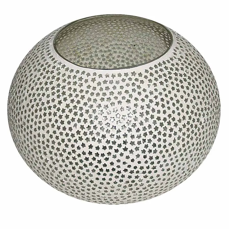 Een waxinelichthouder van glas handgemaakt in India. Het glas is doorzichtig en de buitenkant wit van kleur. Als u er een kaarsje in brand dan schijnen de transparante sterren betoverend door.