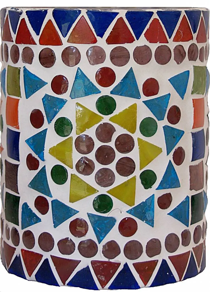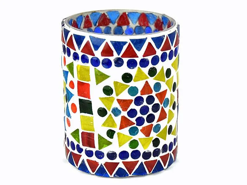 Rond cilindervorm model is er gebruikt om deze mooie glazen mozaiek waxinelichthouder te maken. Op het glas zijn er diverse vormen zoals rondjes, driehoek en vierkante stukjes gekleurd glas te vinden welke in het witte voegsel zijn te vinden.
