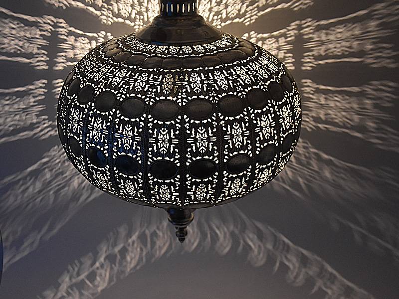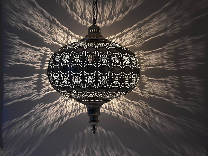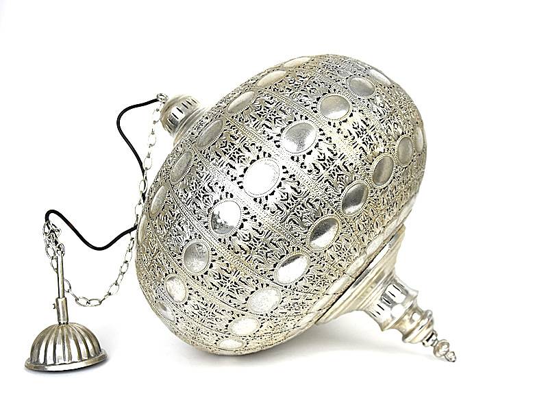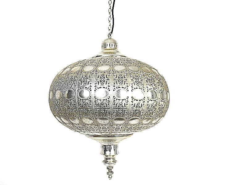 Grote chique hanglamp met rondom ronde plaatjes welke dat prachtige effect geven kwa patroon op de muur en plafond. Gemaakt van metaal en in mooie vintage zilver kleur. De oriëntaalse punt onderop de lamp maakt het dat het een echte oosterse sfeerverlichting is welke zeker uw huis in 1001nacht sferen brengt.