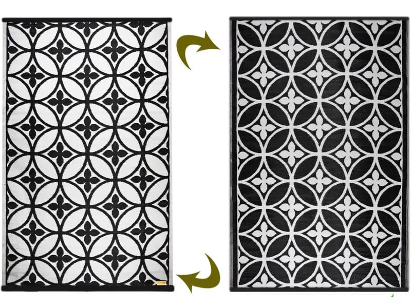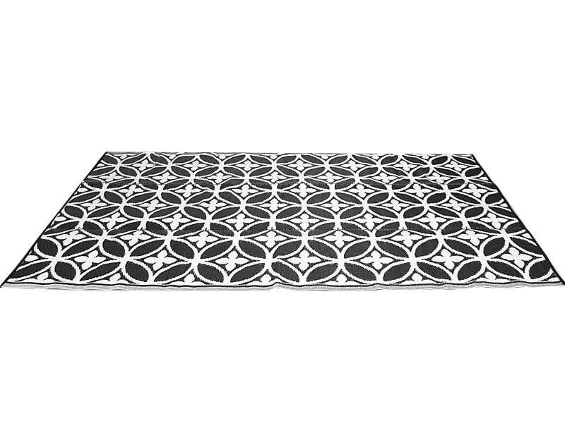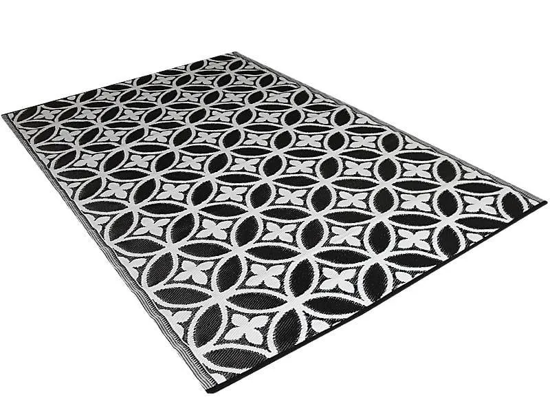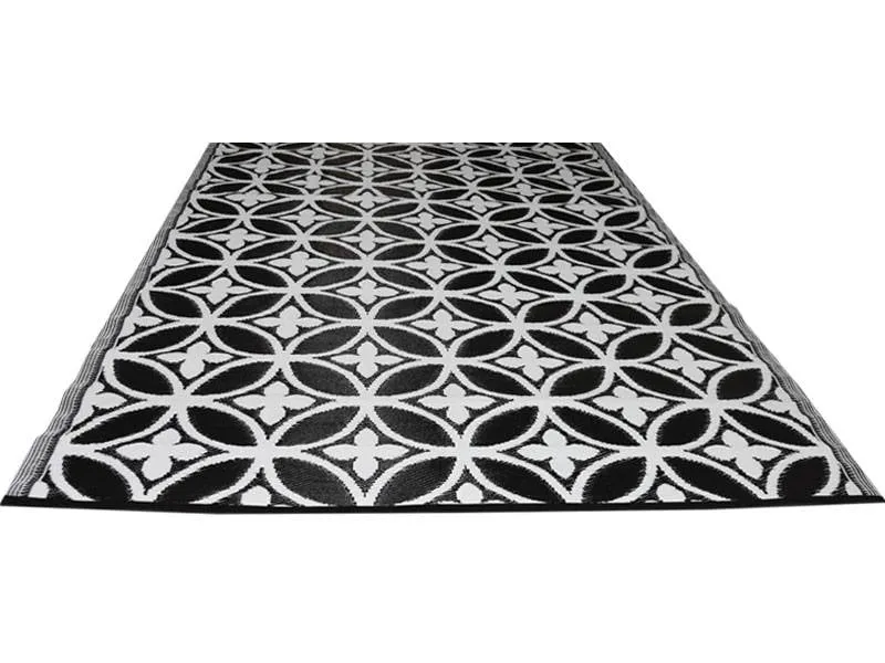 Stijlvol en chique groot buitenkleed in zwart wit kleuren door elkaar gevlochten. De patronen doen denken aan luxe tegels, maar het is veel makkelijker om een plastic buitenkleed neer te leggen. Zo heeft u in een keer een heel ander uiterlijk aan uw tuin of terras gegegeven. Gemaakt in India van plastic gevlochten rietjes. Het kleed wordt gevouwen opgestuurd en als de zon erop gaat schijnen en het plastic warm wordt ziet u vanzelf dat de naden minder zichtbaar worden en het kleed platter gaat liggen.